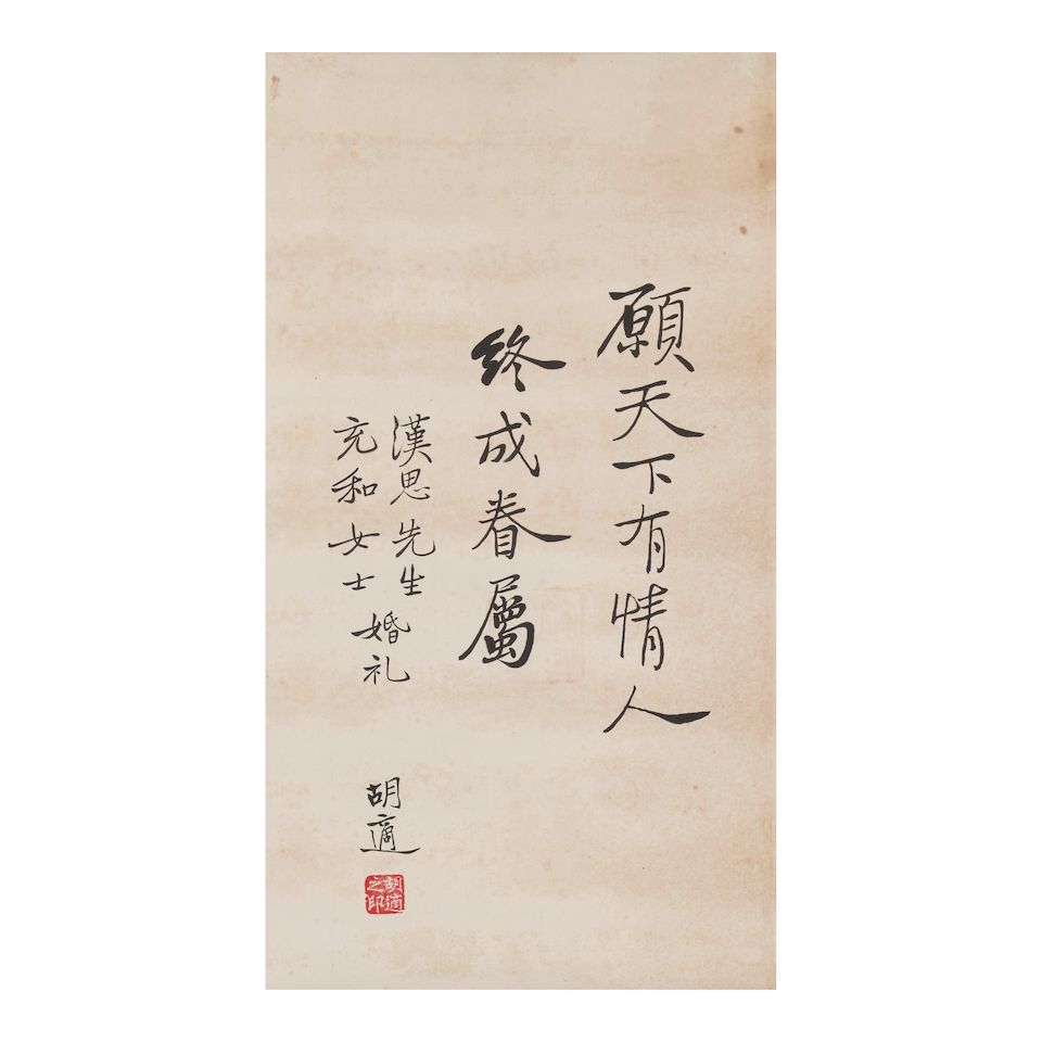 Hanging scroll, with a dedication to Zhang Chonghe (Chang Ch'ung-ho, 1914-2015) and her spouse, Hans Frankel (Fu Hansi, 1916-2003) on the occasion of their marriage
