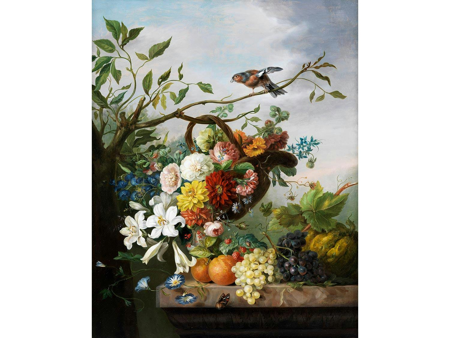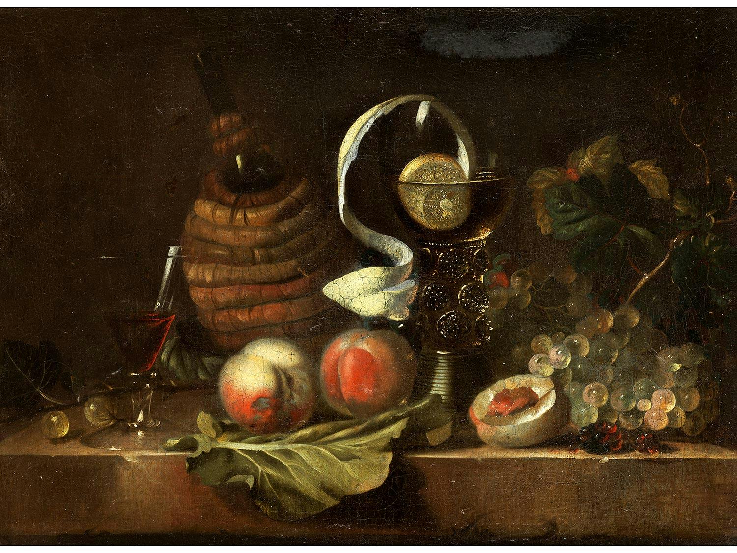 FRÜCHTESTILLLEBEN MIT WARZENGLAS UND BASTFLASCHE