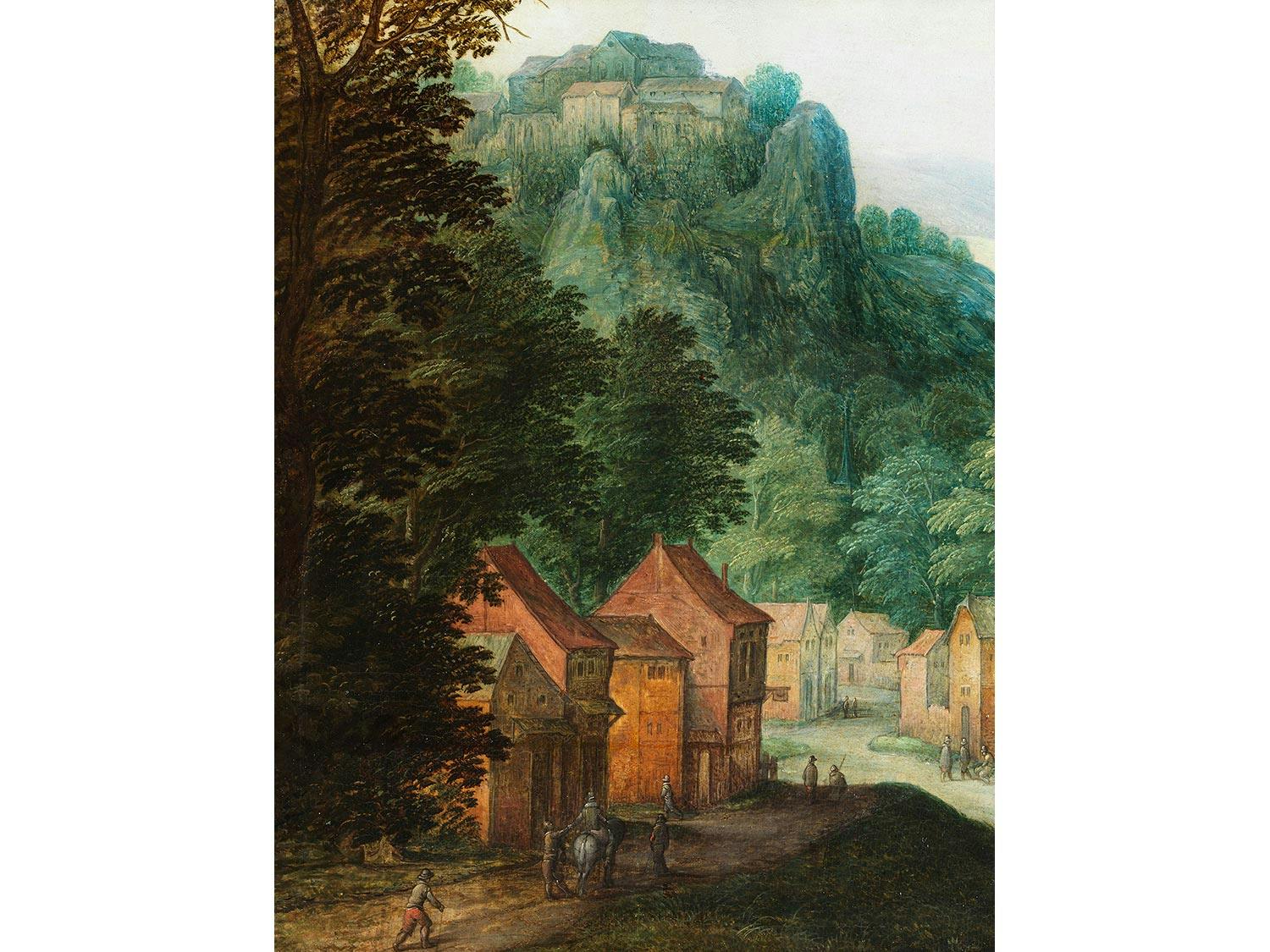 HÄUSERGRUPPE UNTER BÄUMEN VOR HOHEM BURGBERG