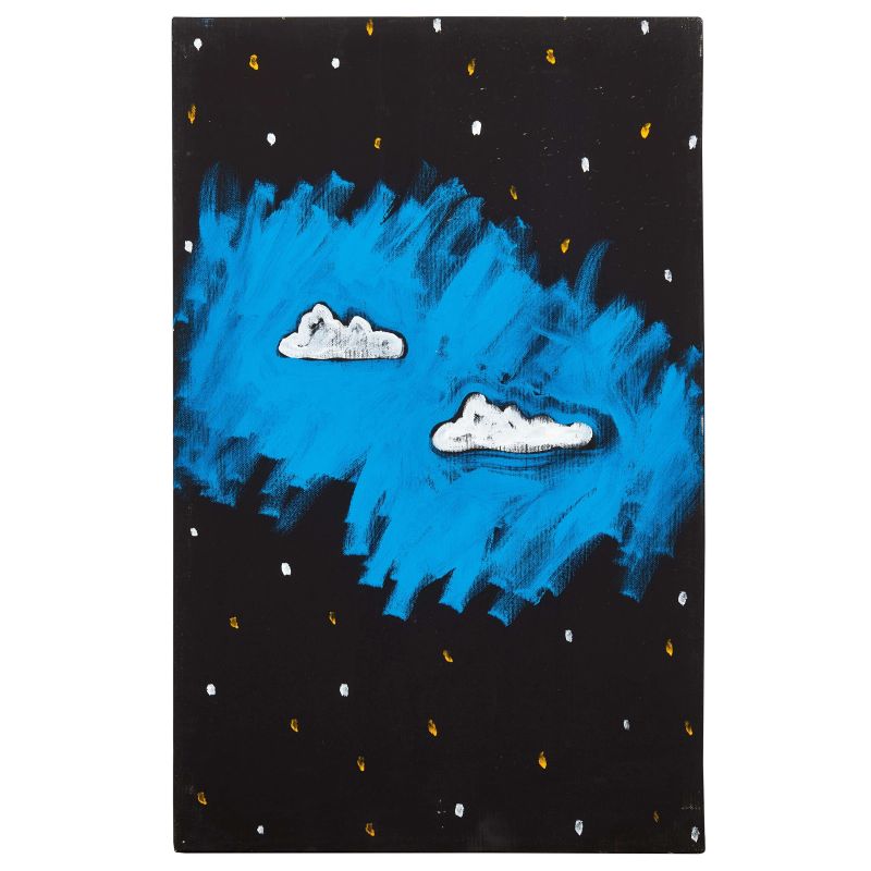 paint on stuffed and sewn fabric, metal shelf and manufactured objects