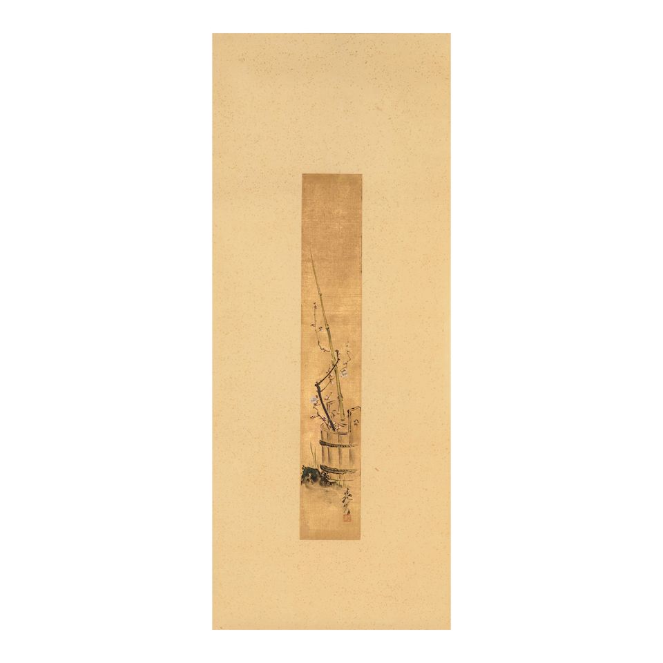 A small album leaf mounted as a hanging scroll, painted in colored lacquer on paper (urushi-e) with eggplants, butterbur, and grasses