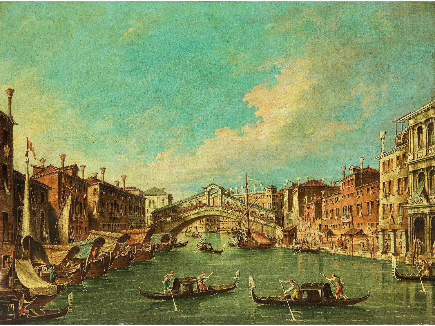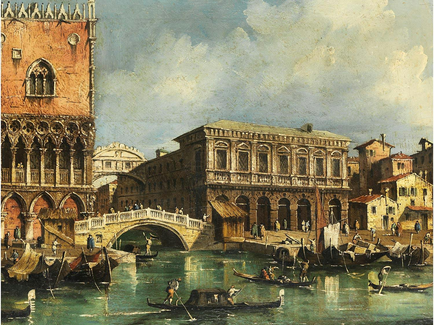 Die Ansicht, aus Richtung der Dogana gesehen, zeigt die Situation im diesigen Morgenlicht. Die von Palladio errichtete Kuppelkirche, mit ihren typischen Architravvoluten, erhebt sich über die damals noch niedrigen seitlichen Bauten, unter einem hellen Himmel mit gebauschten Wolken. Es ist die freundliche Farbigkeit, das südliche Licht, das auch hier über der Lagunenstadt liegt. Die Ruhe der Architekturwiedergabe setzt sich in den dahingleitenden Gondeln und Segelschiffen fort. Diese Charakteristika erweisen sich im Vergleich mit seinem Werk als typisch.Als Sohn des Francesco Guardi (1712–1793) widmete Giacomo sich im Gegensatz zu seinem Vater vermehrt dem mittleren Format. Die Reduktion der Farbigkeit, verminderte Buntheit und Konzentration auf helle Lichteffekte gegenüber verschatteten Partien, sind Charakteristika, die sich vom Werk des Vaters unterscheiden. Dabei geht das Gemälde auf ein Vorbild des Vaters zurück, das sich im Pariser Louvre befindet. Eine weitere, nahezu gleiche Darstellung von anderer Hand besitzt die Nationalgalerie in Washington. Weitere Vergleichsbeispiele sind in der beiliegenden Expertise aufgeführt.