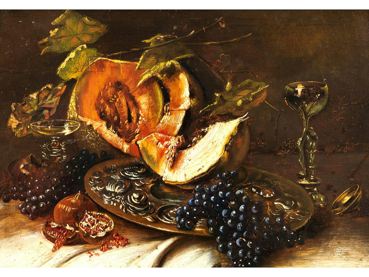 STILLLEBEN MIT MELONE, GRANATAPFEL UND WEINTRAUBEN