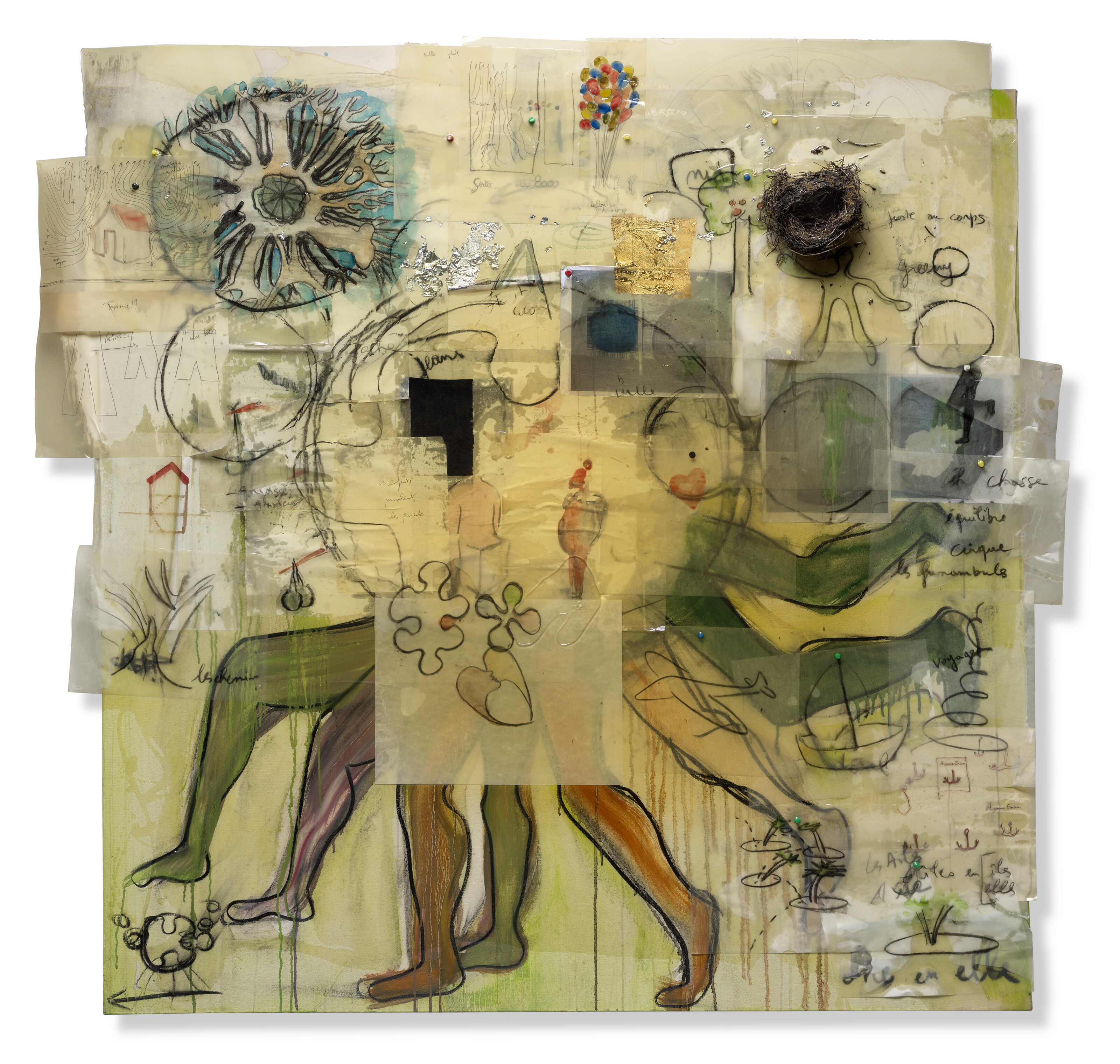 huile, fusain, graphite, aquarelle, encre, résine, vernis, collage de papiers, feuilles de métal et assemblage de brindilles et punaises sur toile