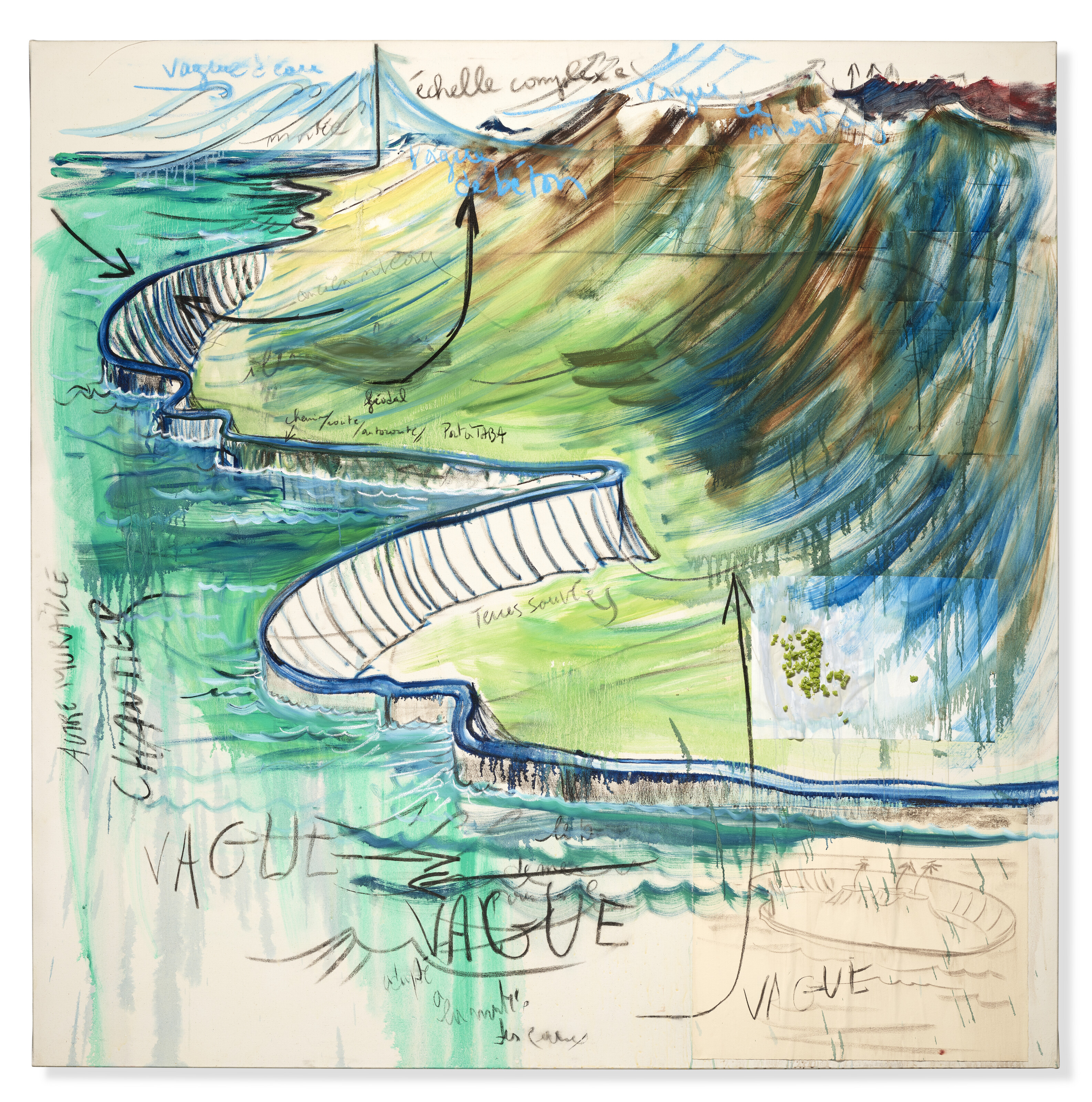 huile, aquarelle, pastel, fusain et collage de papiers et mousse synthétique sur toile