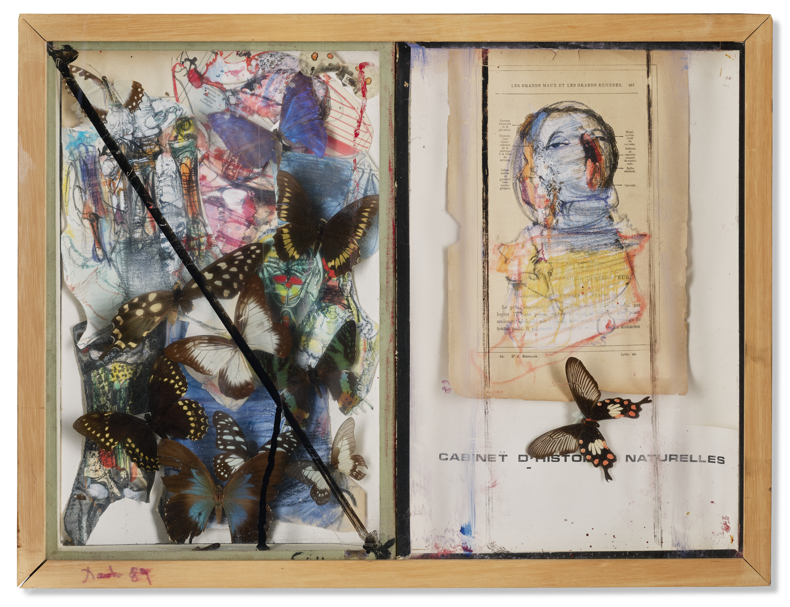 gouache, pastel, graphite, crayon de couleurs, feutre et assemblage de papiers, papillons et aiguilles sur papier; dans une boîte d'artiste