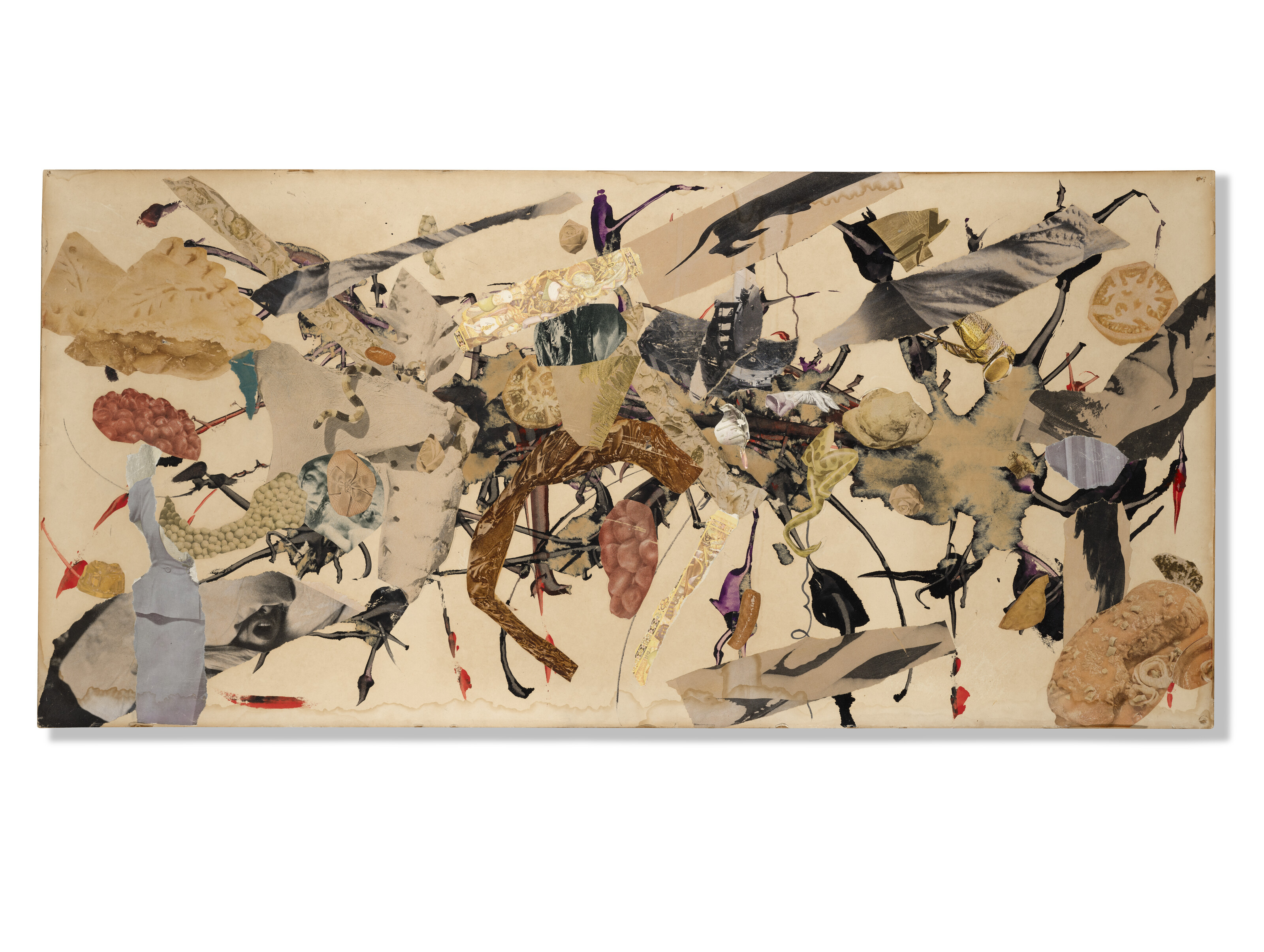 huile et collages de fragments d'illustrations de revues découpés et déchirés sur papier marouflé sur isorel