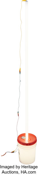 White plastic bucket with orange lid, transformer, electrical wiring, and fluorescent light fixture