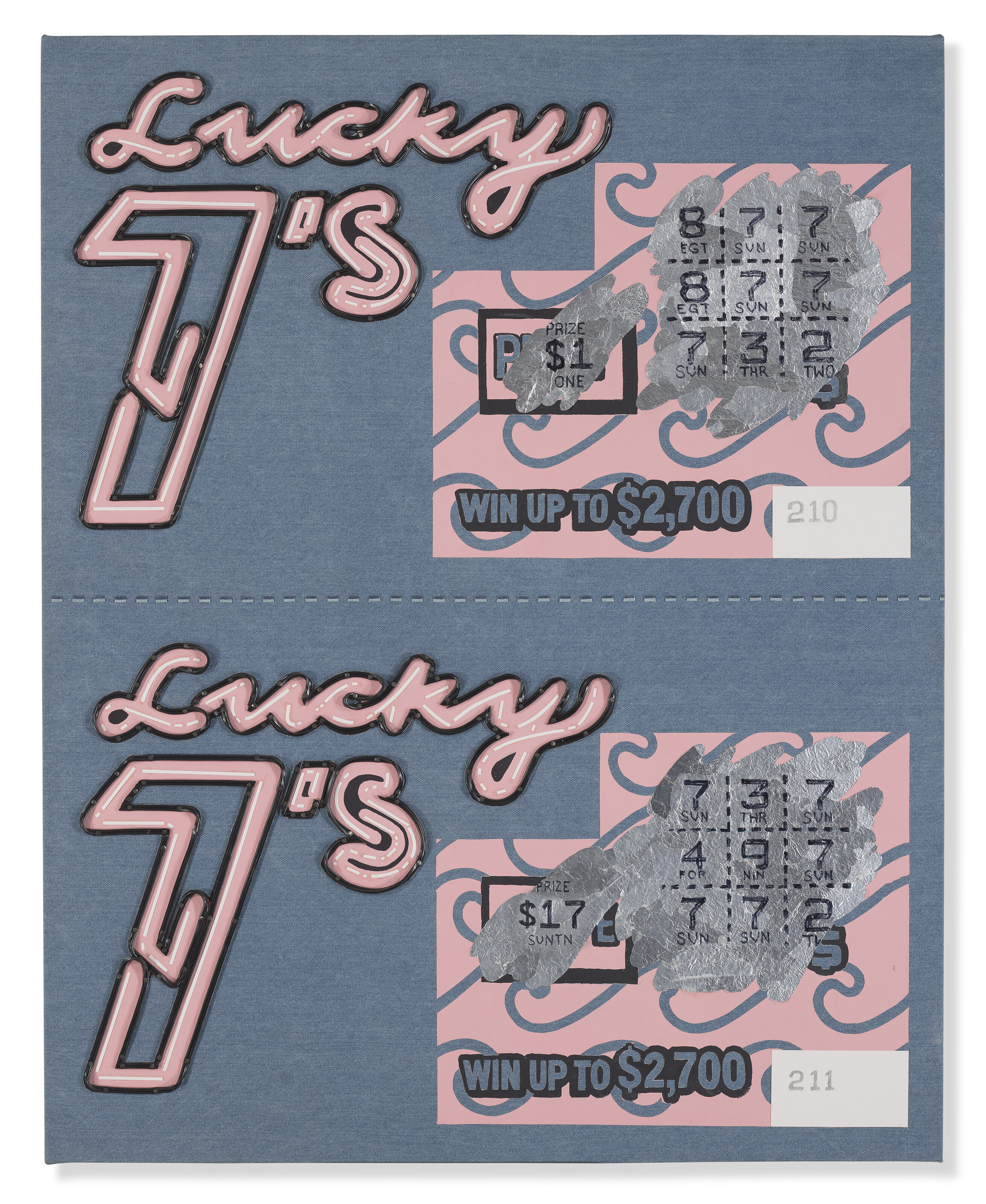 paper, Sharpie, tinfoil, Flashe, graphite, nails and electrical wire on denim mounted on panel