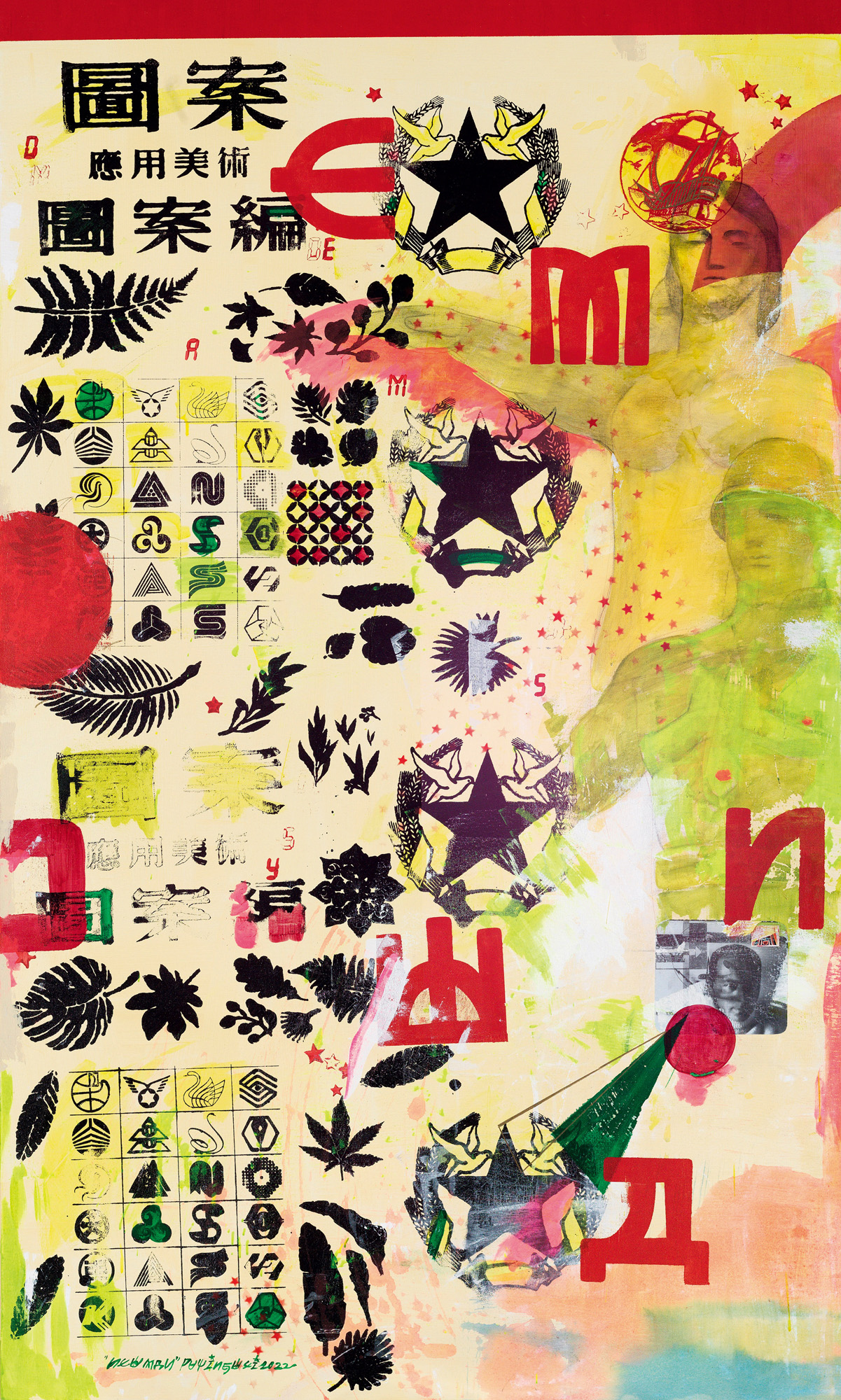 Acrylic on canvas, silk screen printing, paper collage, silk screen printing, spray painting, stamps, paint pens, graphite, watercolor, markers