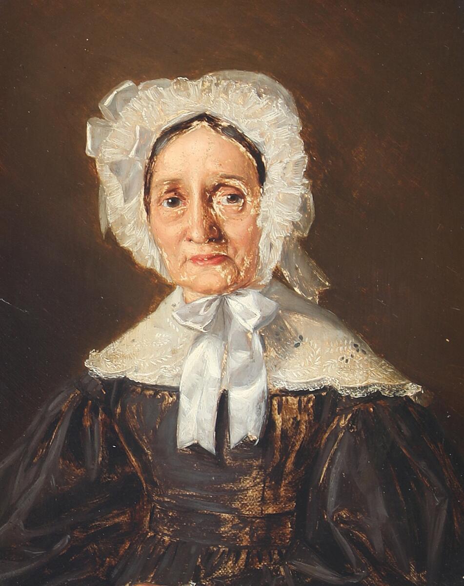 An elderly lady with a white bow