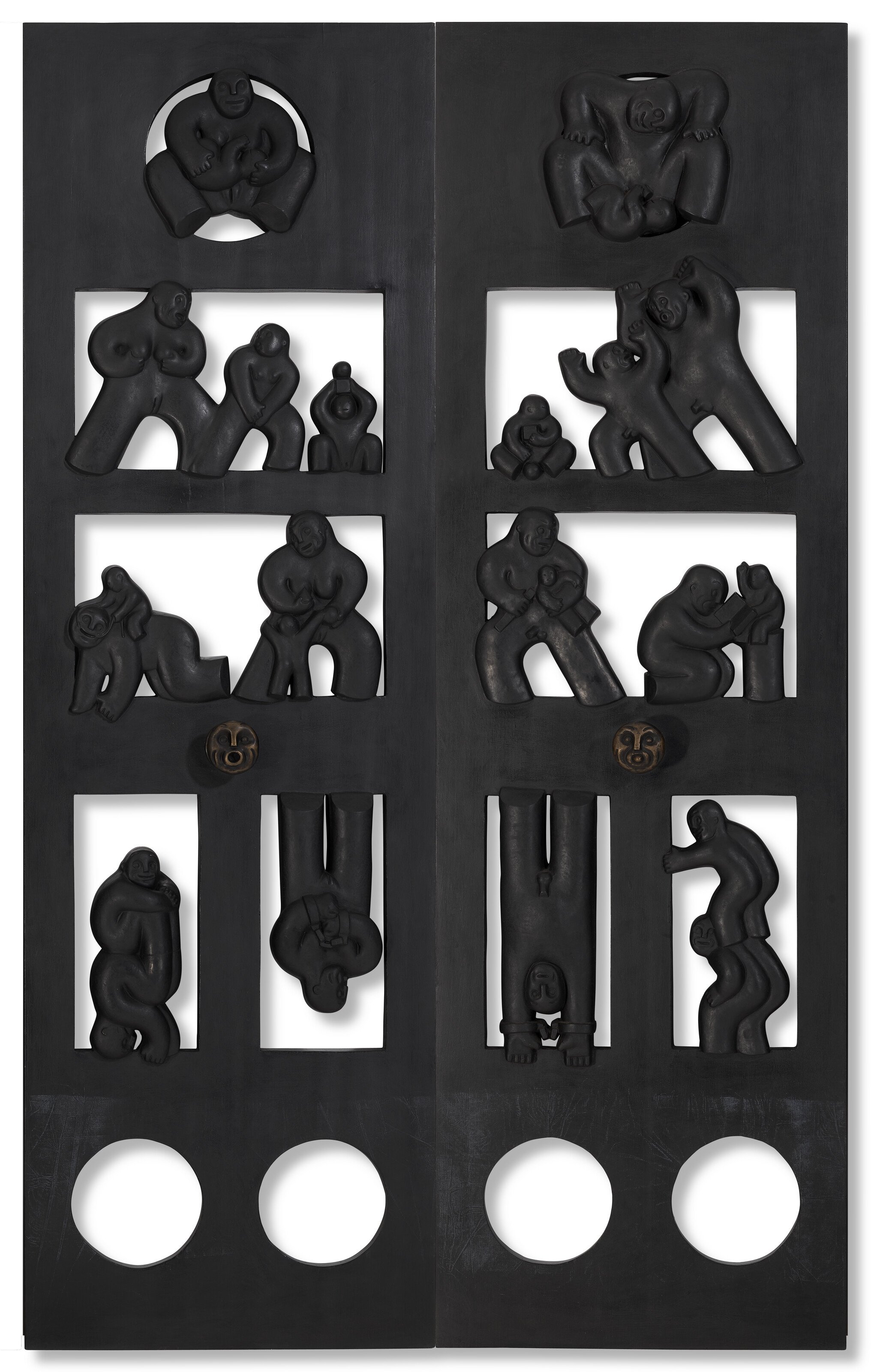 epoxy paint, graphite and bronze on solid wood door and pressed wood reliefs, in two parts