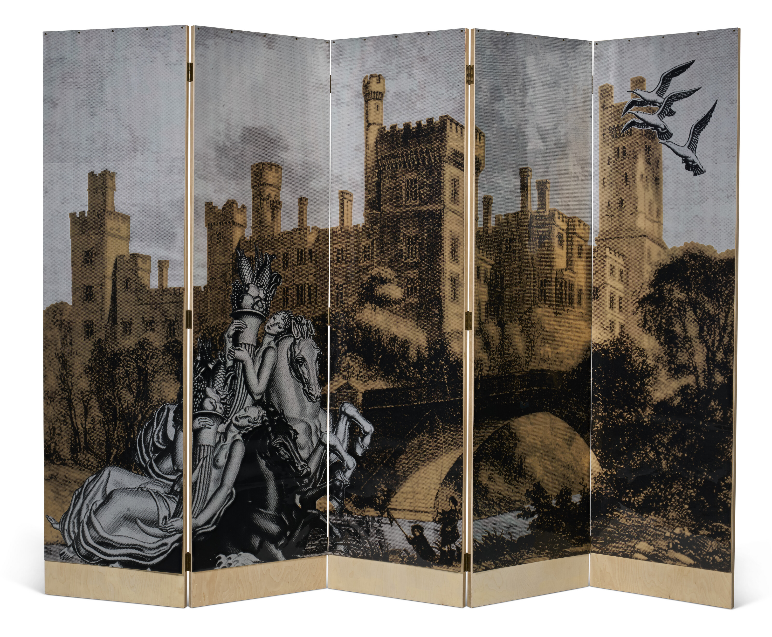 acetate, foil, brass tacks, mdf folding screen with five panels, framed projection screen and one video disc and two Blu-Ray video discs and one master thumbdrive