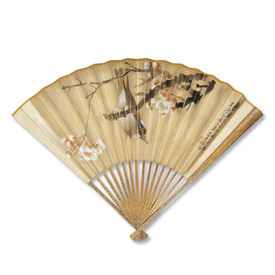 Folding fan, the painting ink and color on gold paper, inscribed by the artist with a dedication to Jingwu