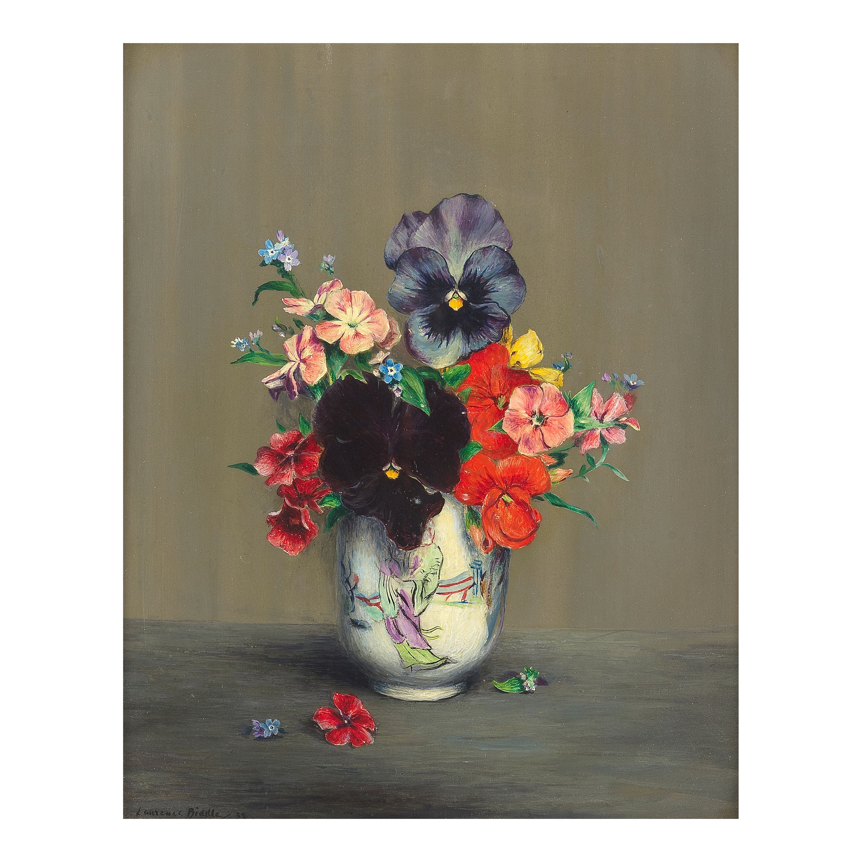 Still life of flowers, including pansies, geraniums, phlox and forgetmenots...
