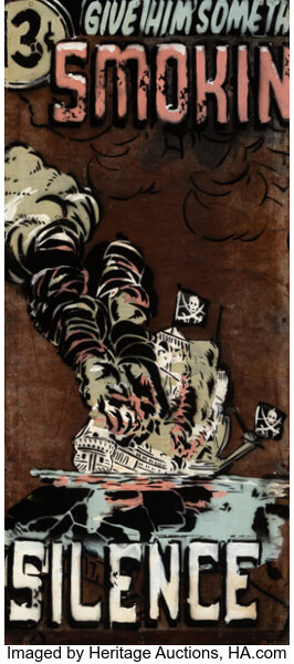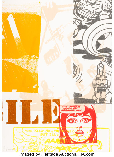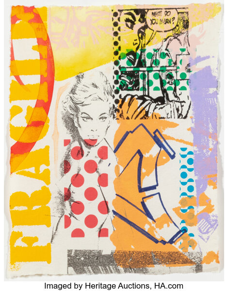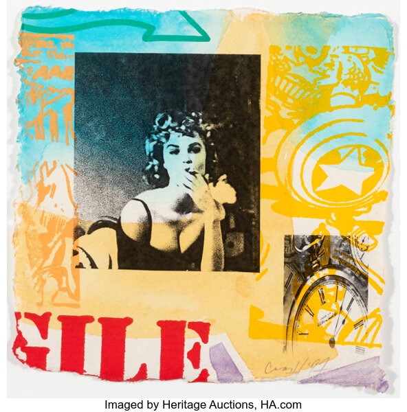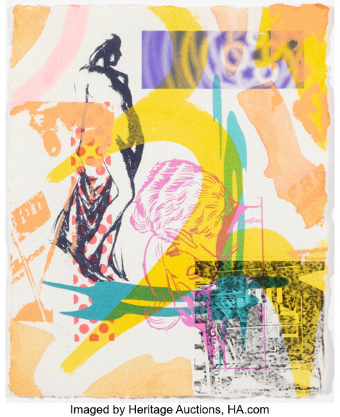Screenprint in colors, repourposed stencil, and collage on w...