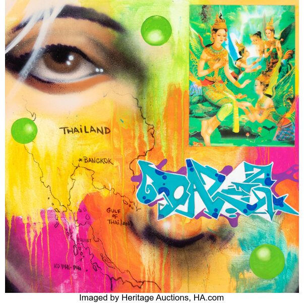 Acrylic, spray paint, and collage on canvas