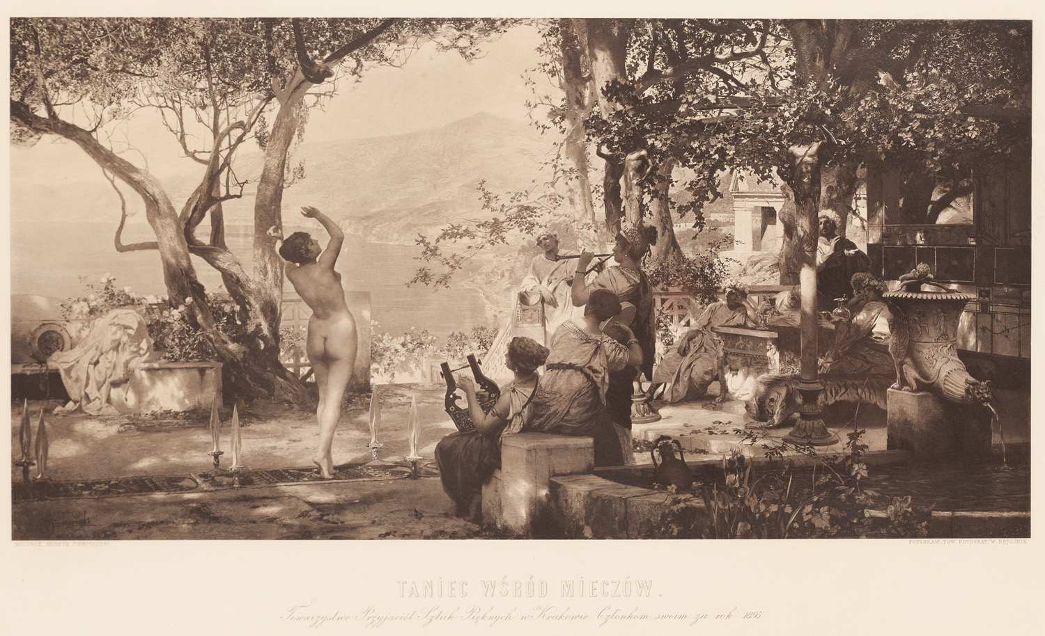 Washerwomen and a seated child with a dog, by a grand staircase through a c...