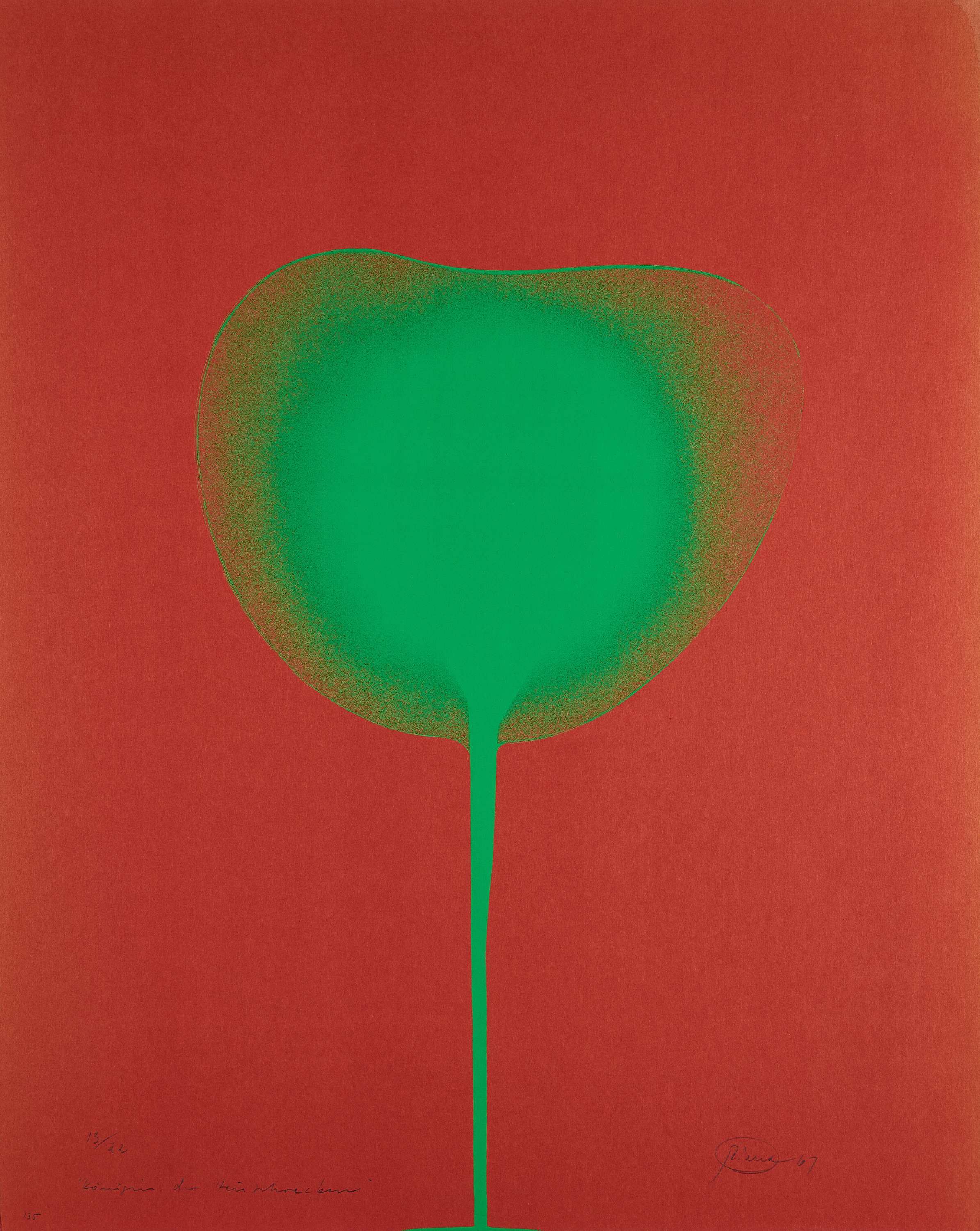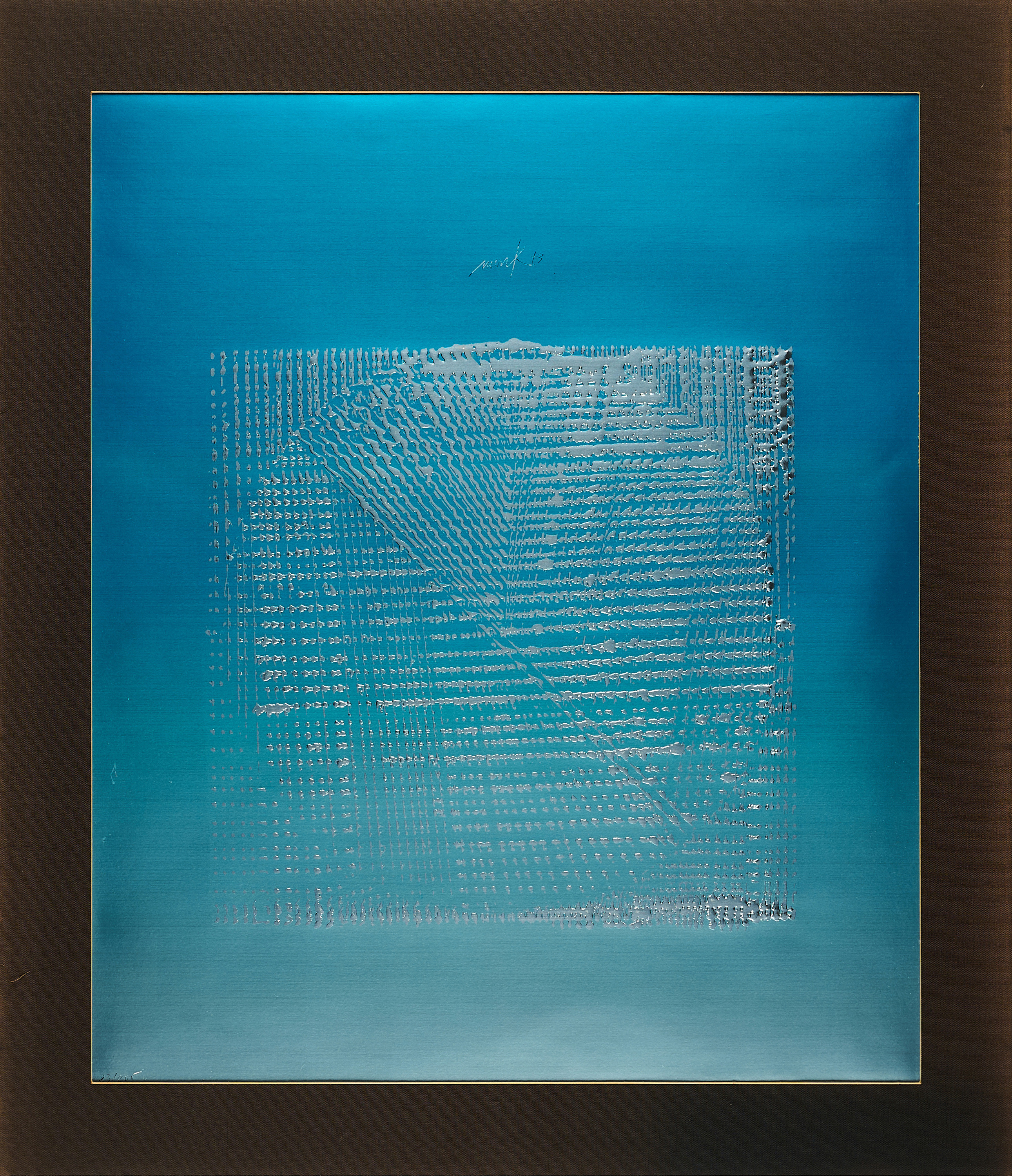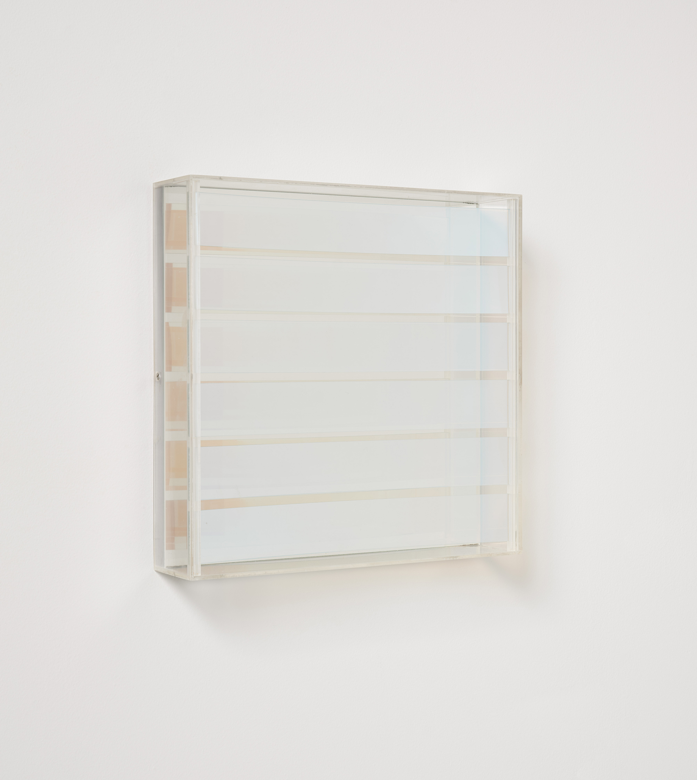 Colour silkscreen on acrylic glass over colour silkscreen on acrylic glass in metal frame on acrylic glass base