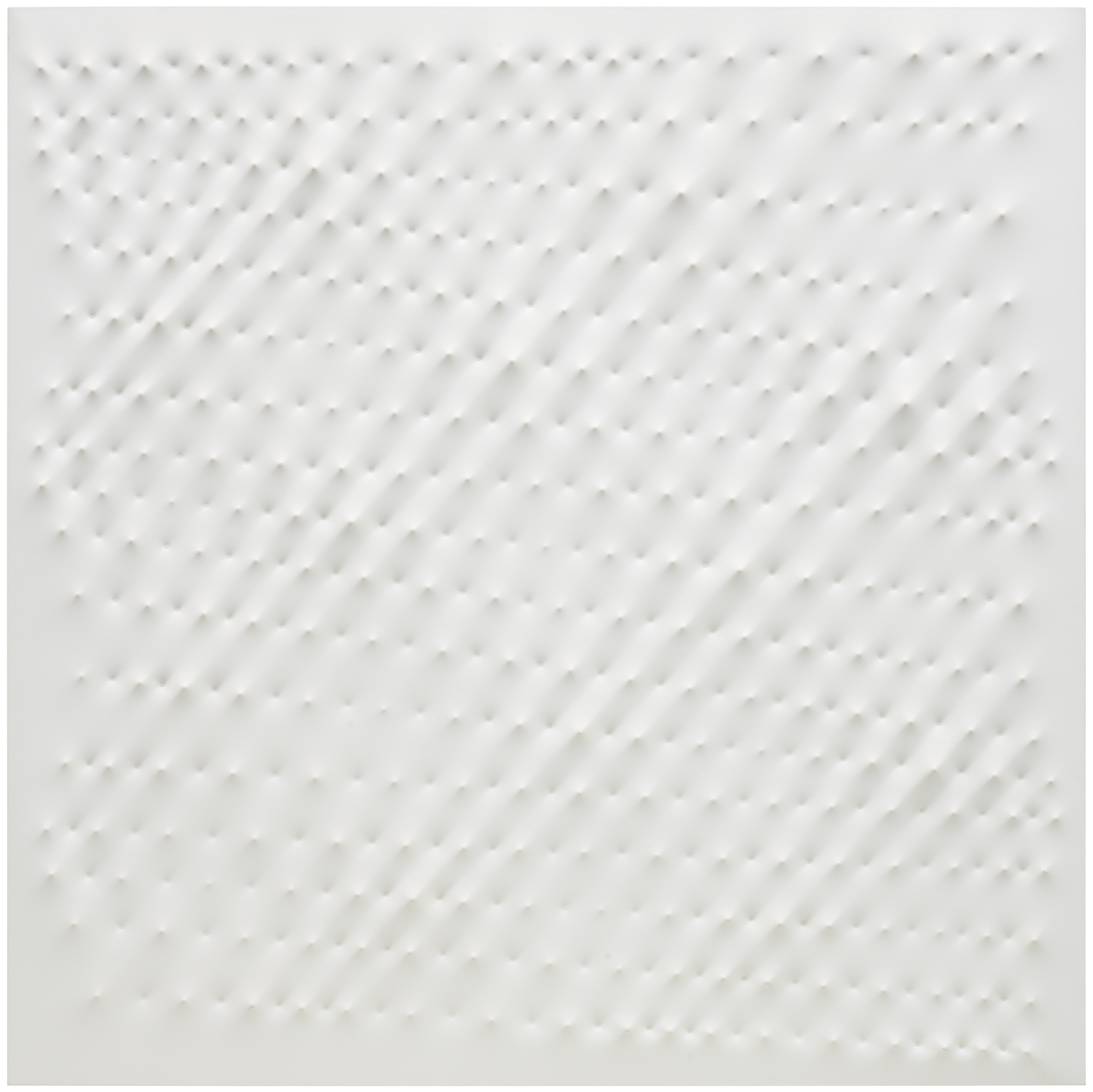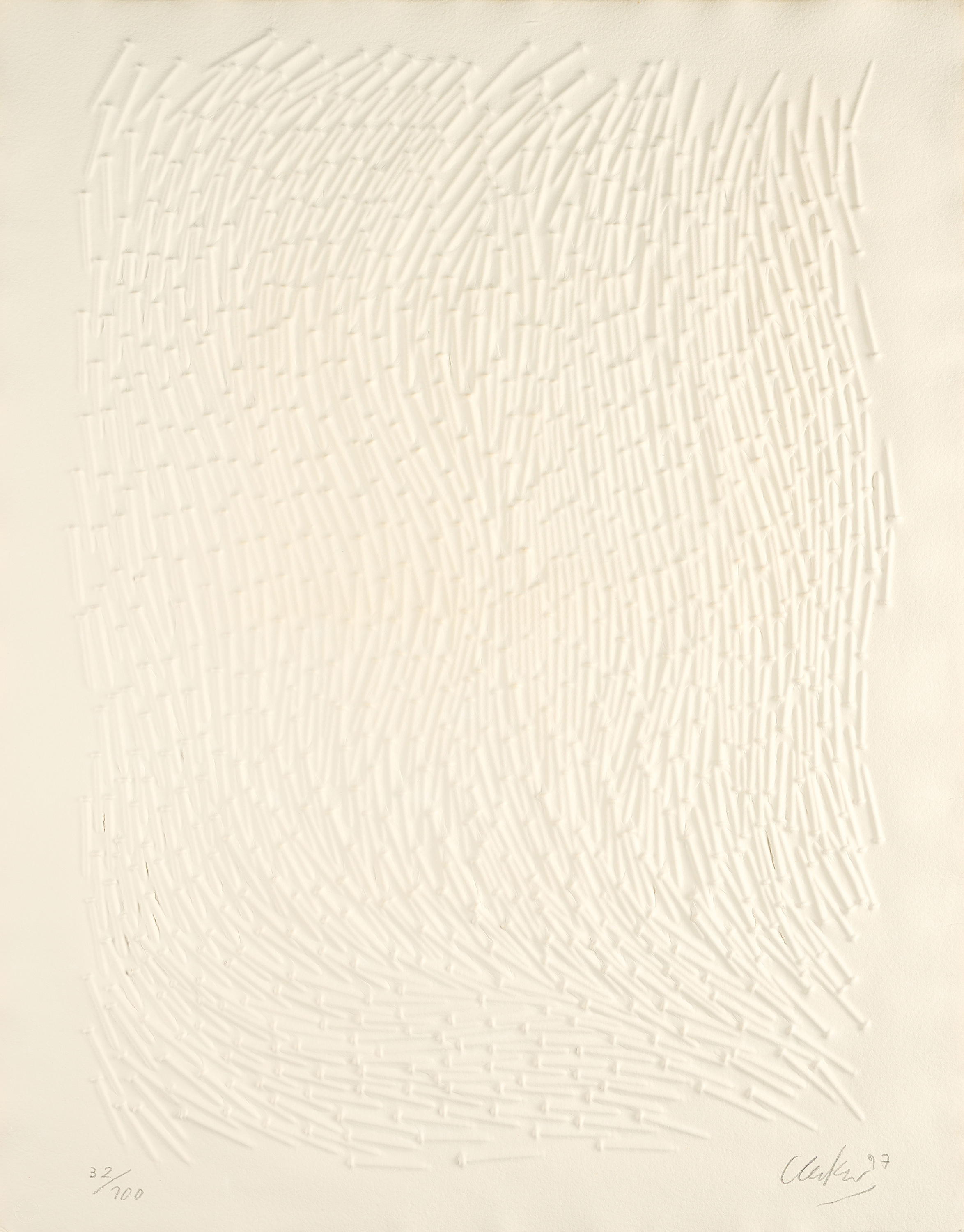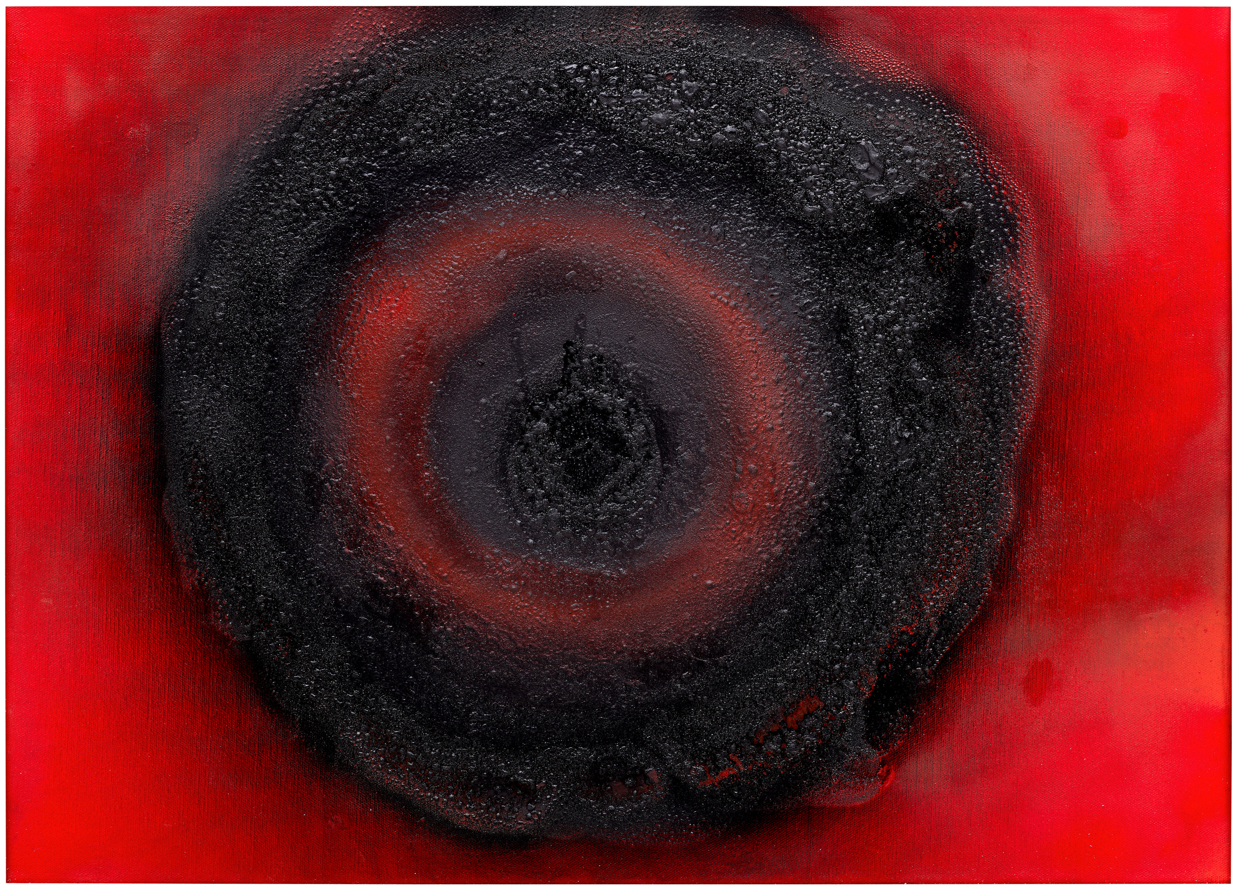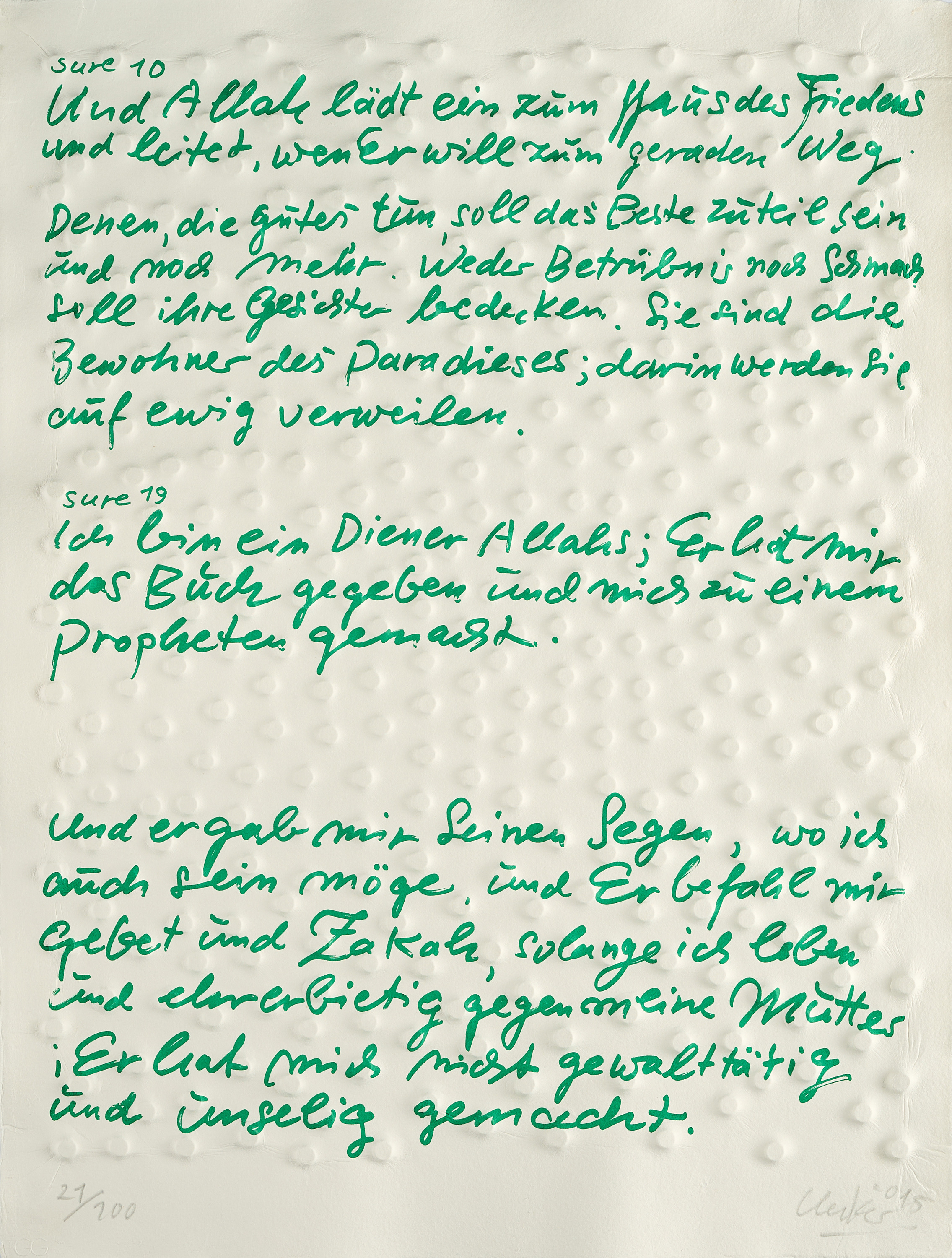 Colour silkscreen on acrylic glass over colour silkscreen on acrylic glass in metal frame on acrylic glass base