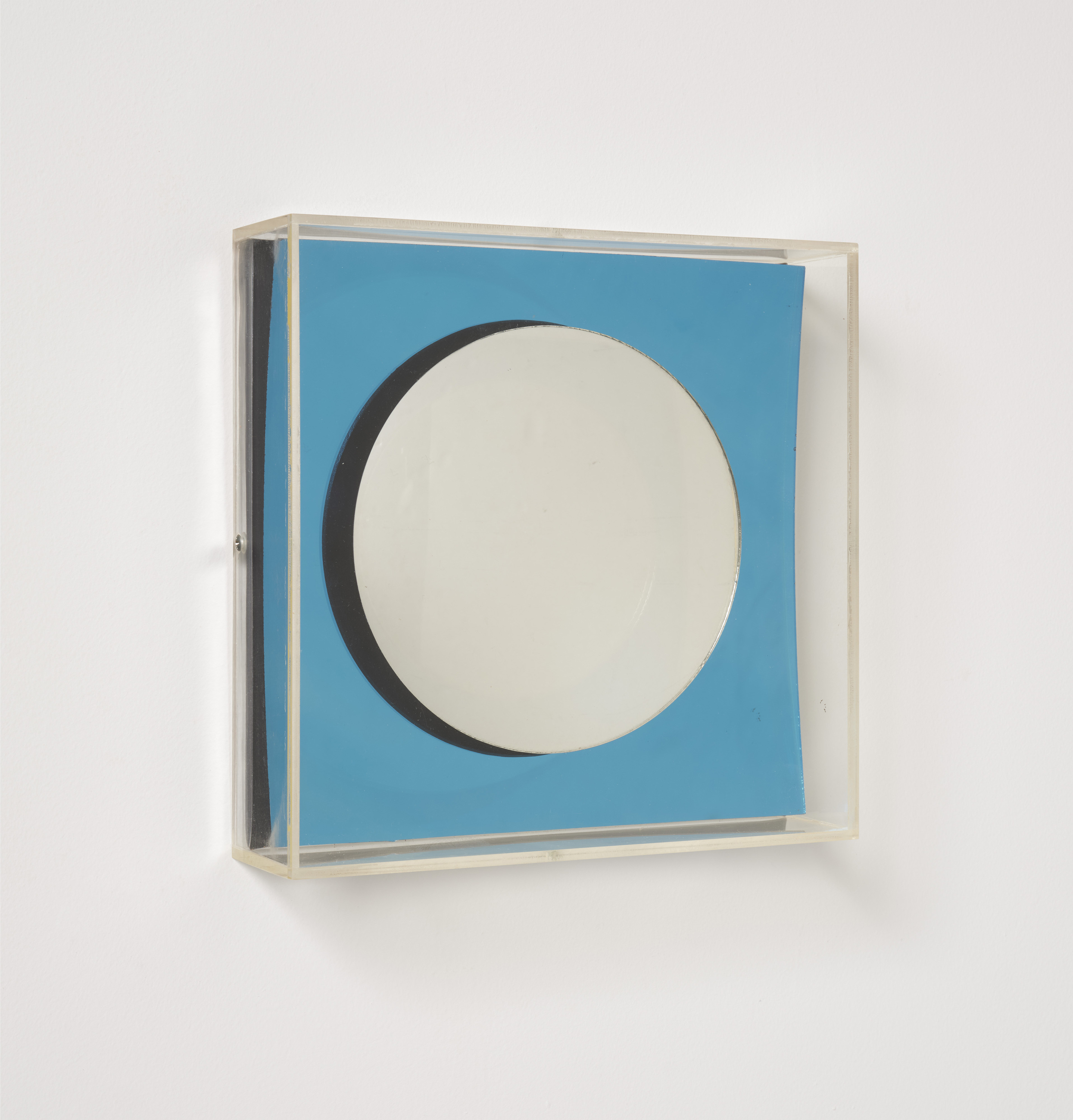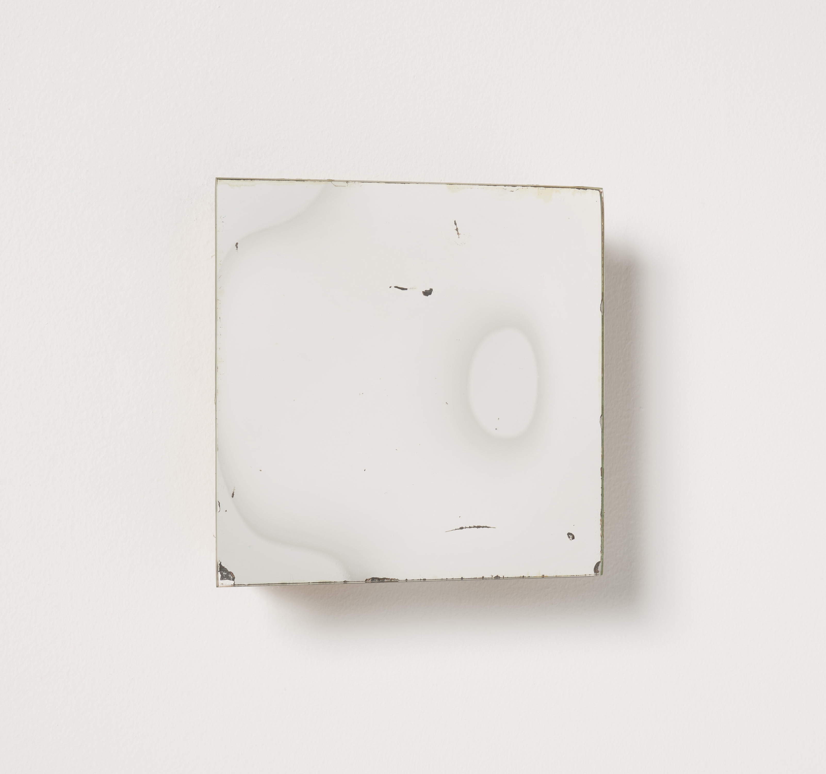 Semi-transparent convex mirror over silver-coloured card. Beneath silver-coloured card. In display box