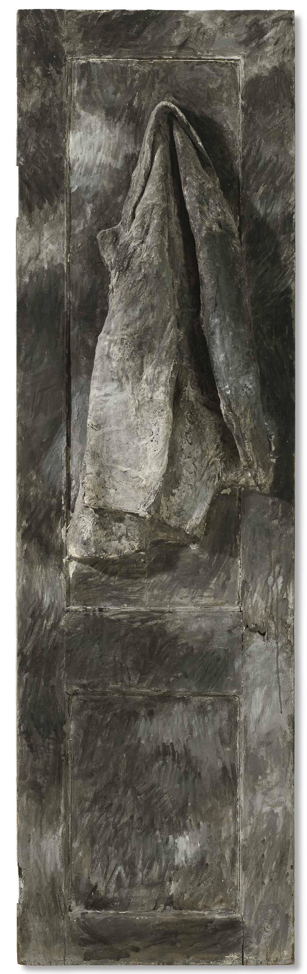 Collection of acrylic paint, brushes and cut-up brass instruments on canvas