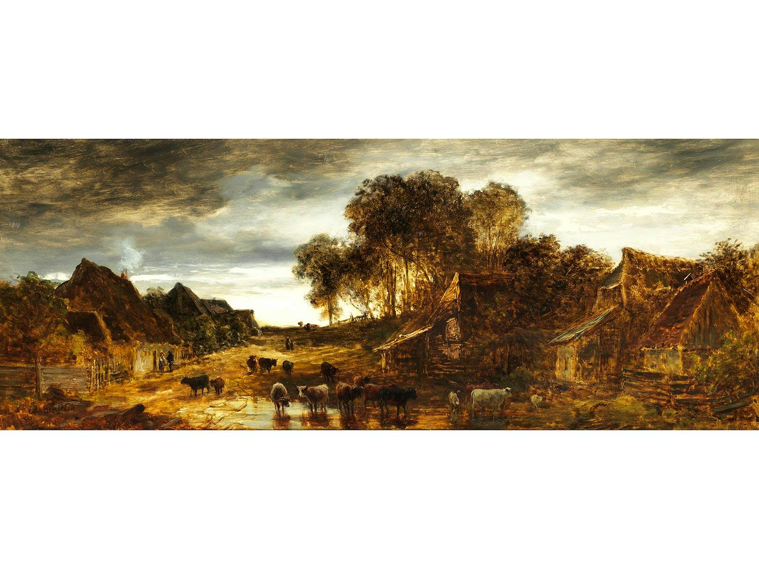 ABENDLICHE DORFLANDSCHAFT MIT HEIMKEHRENDER HERDE, UM 1865