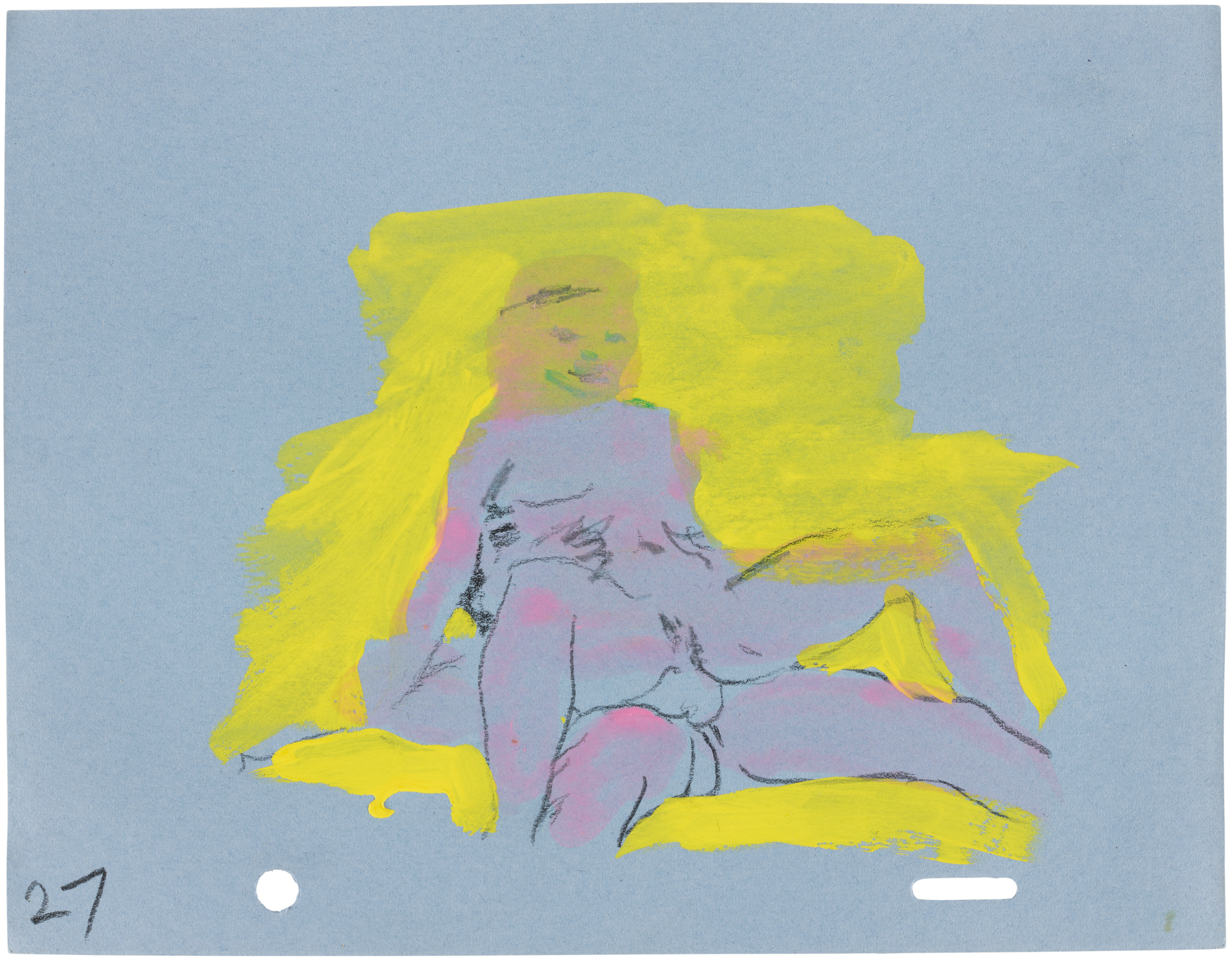 Unique watercolor, crayon and pencil drawing, on blue wove paper with cut-outs