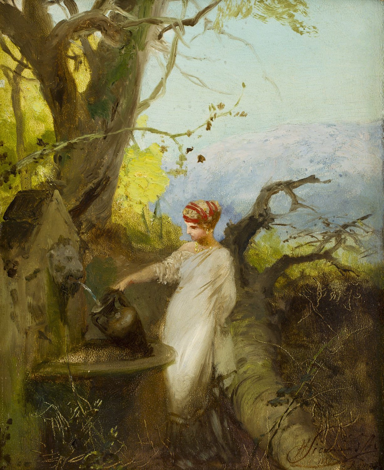 Une Fontaine au jet d'eau dans un paysage, un hermès au premier plan ; Une...