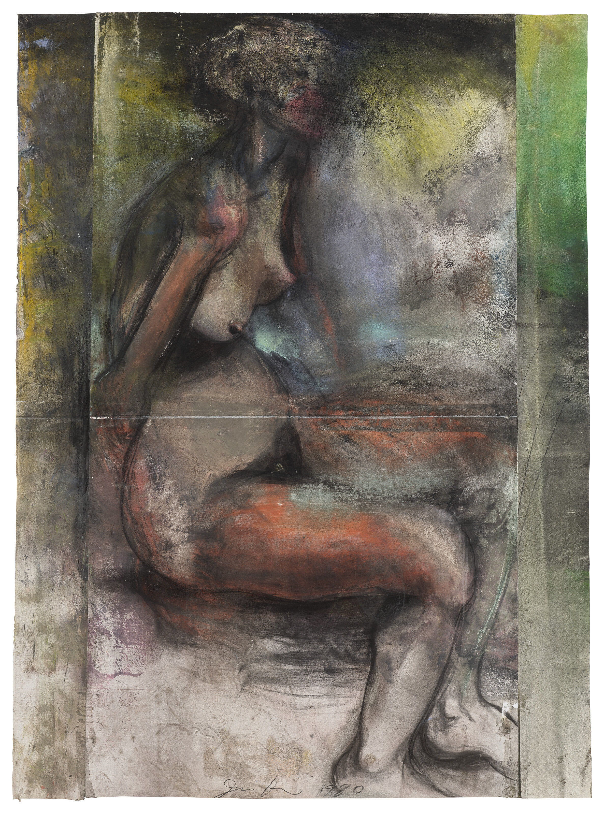 gouache, wax crayon, charcoal, pastel and graphite on three sheets of joined paper