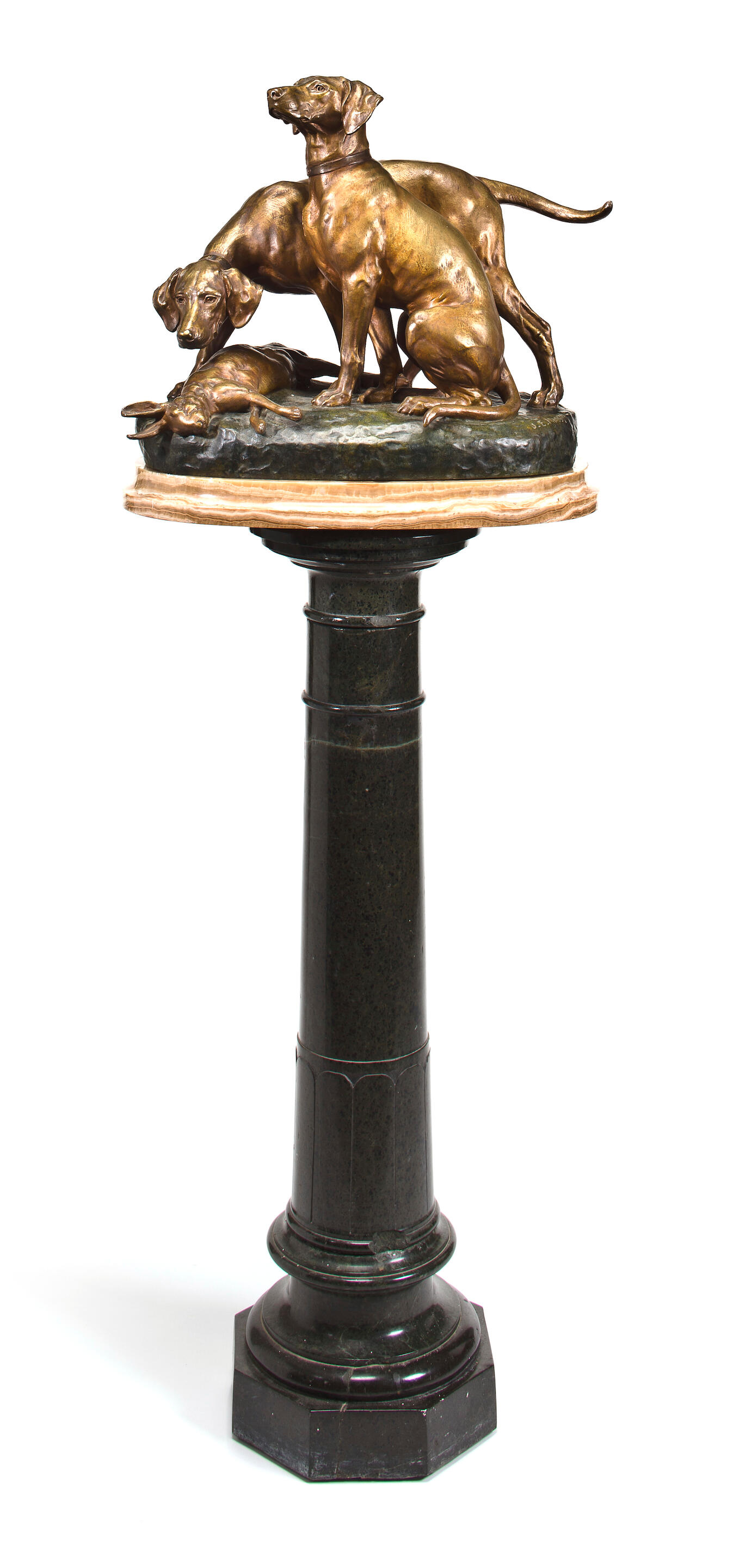one dog seated by its catch, the other standing, on naturalistic base, sign...