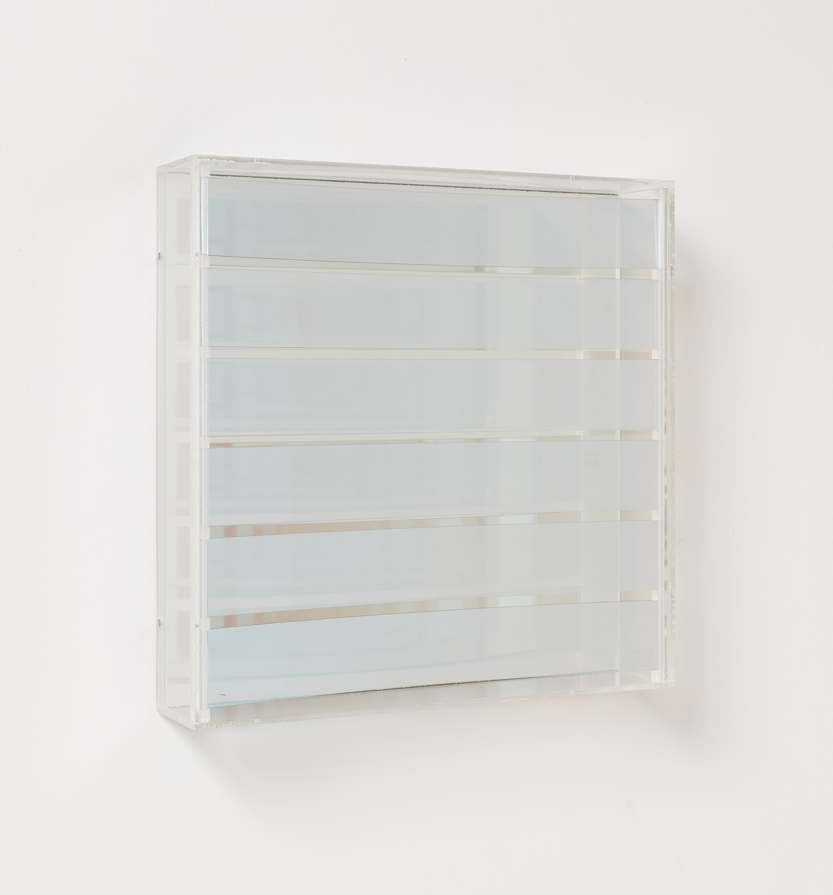 6 semi-transparent concave mirror strips in front of mirror. In Plexiglas box