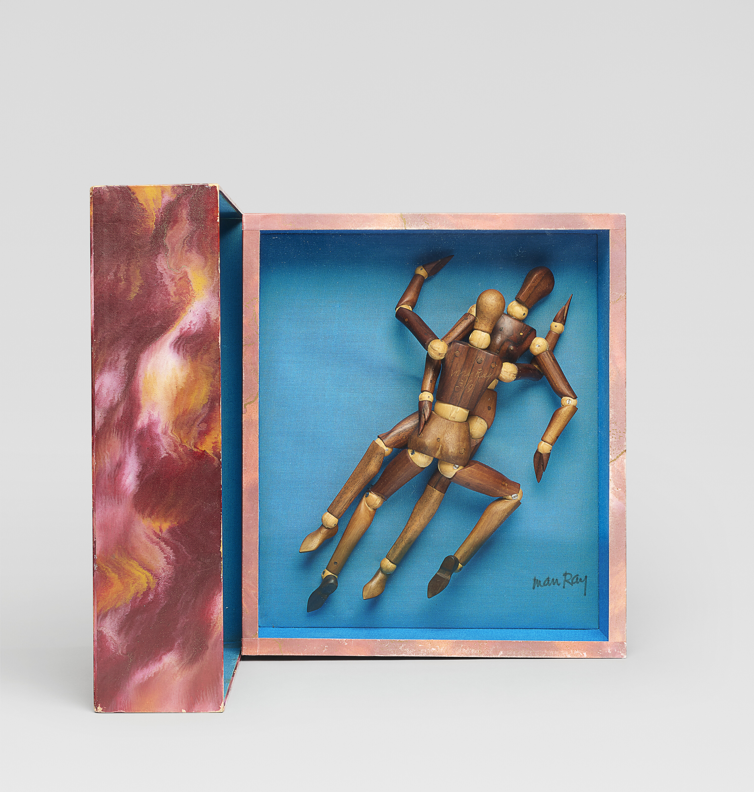assemblage de deux mannequins en bois, masculin et féminin, dans une boîte vitrée montée sous forme de livre