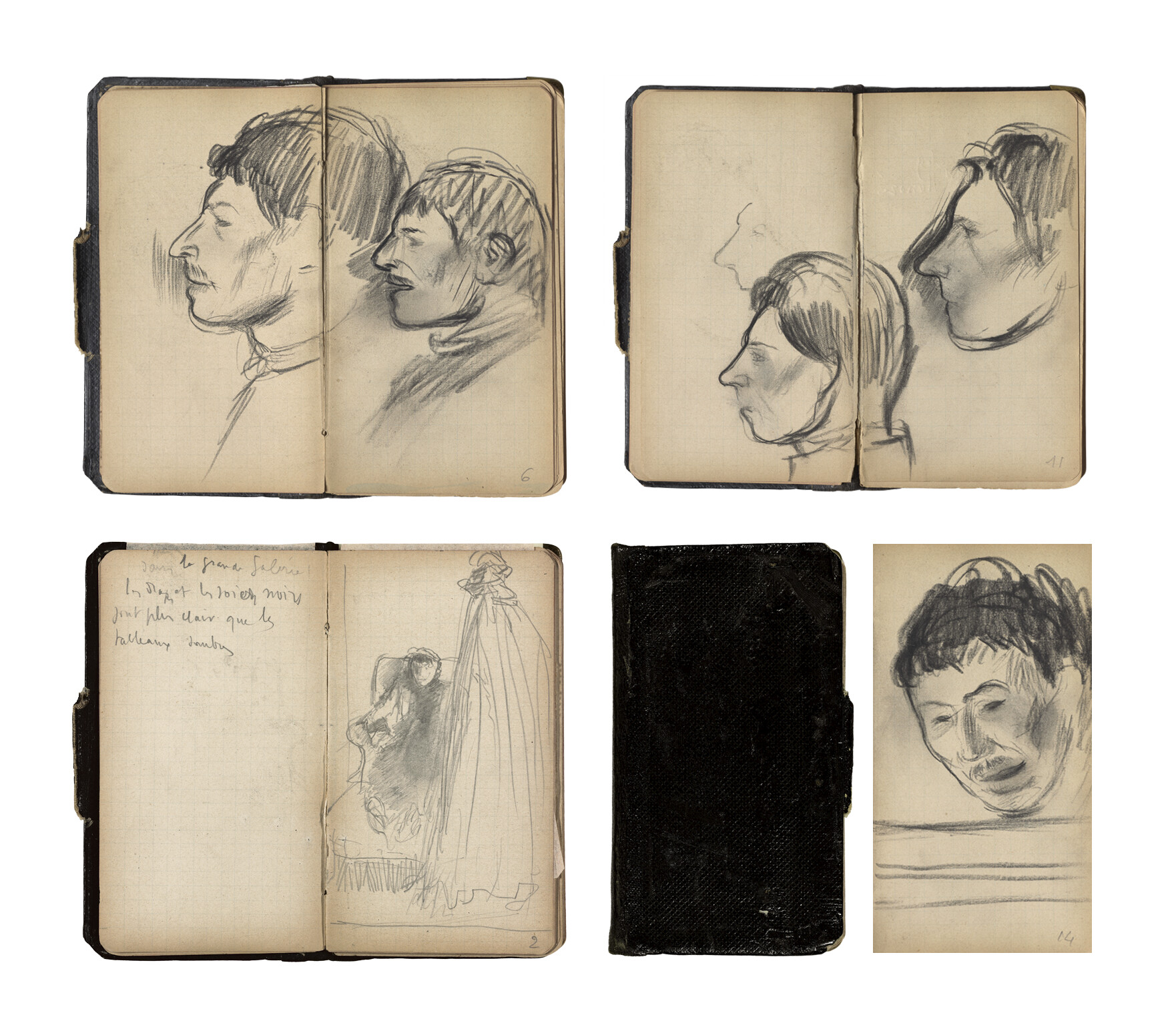 carnet de dessins, reliure toilée, chemise et étui de maroquin vert; graphite et crayon Conté sur papier sur 32 pages comprenant 25 pages de dessins et 7 pages d'annotations