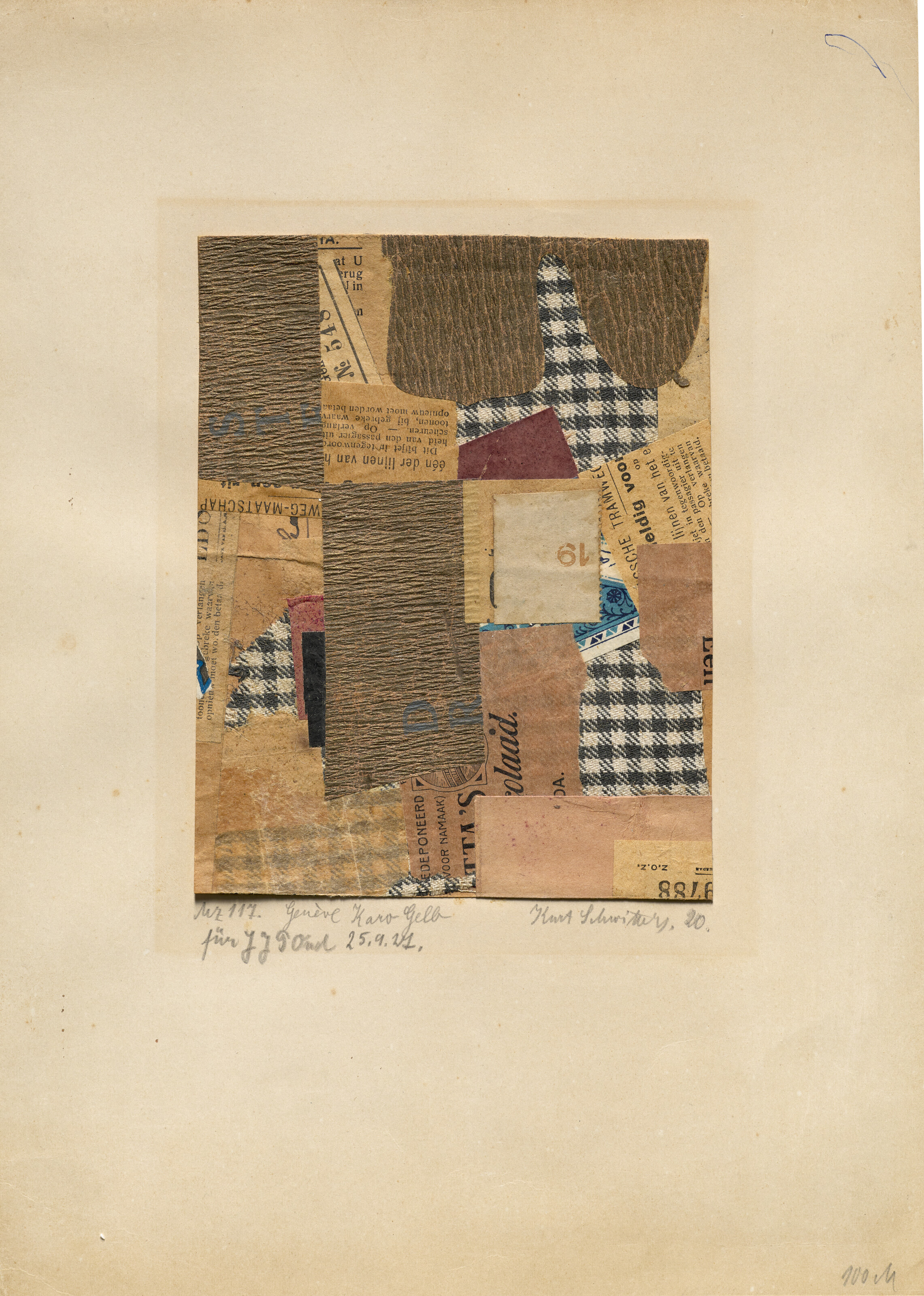 collage d'éléments en tissu, carton, papier journal et papier sur papier fort