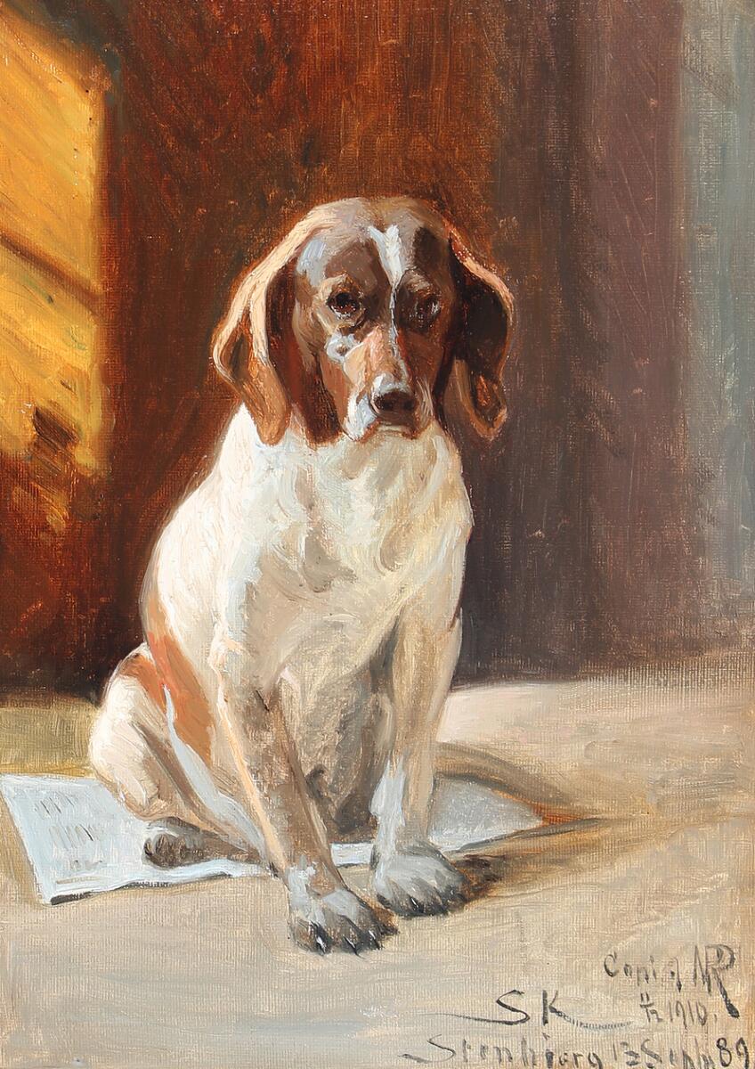 “Jagthund siddende paa en Avis. Hvaps”, (Krøyer's dog 'Hvaps')