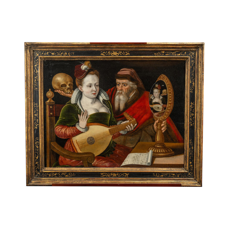Vanitas avec une joueuse de luth et un homme barbu tenant un crane