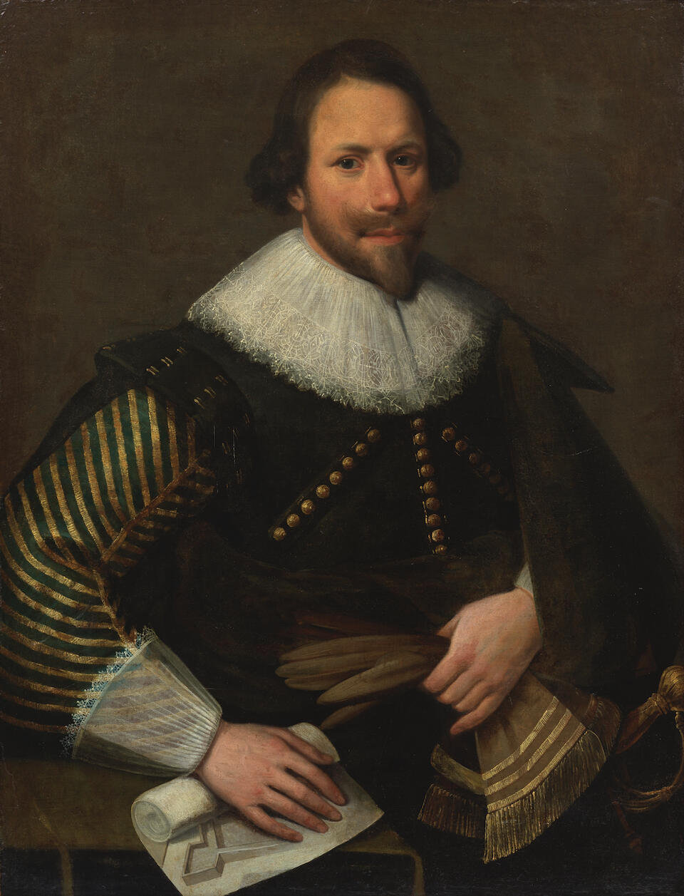 Portrait of an architect, half-length, holding gloves and architectural pla...