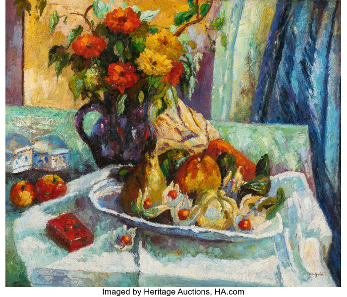 Still life with a pitcher of flowers and a platter of fruit on a table