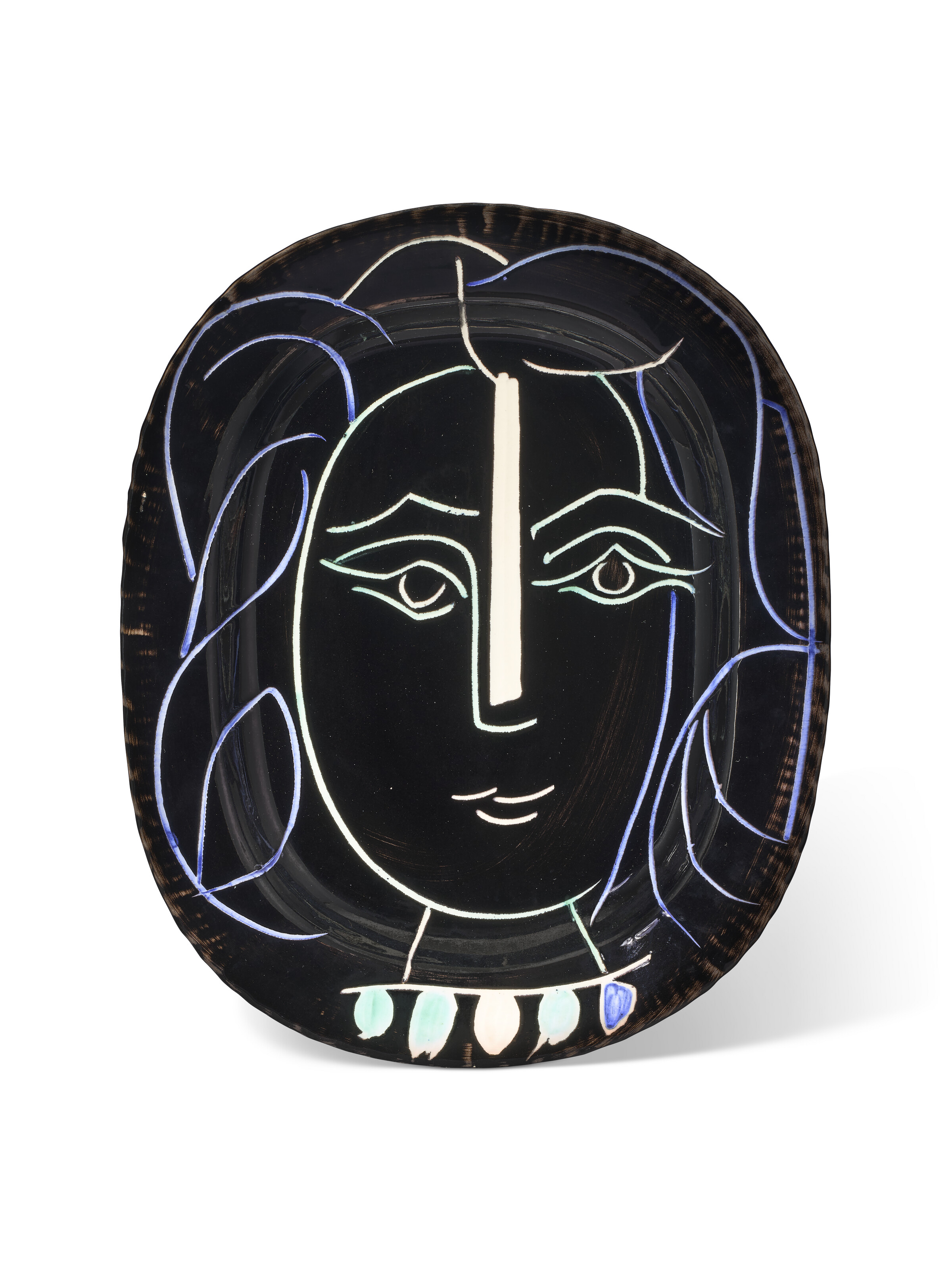 white earthenware ceramic plate with colored engobe, black oxide and glaze