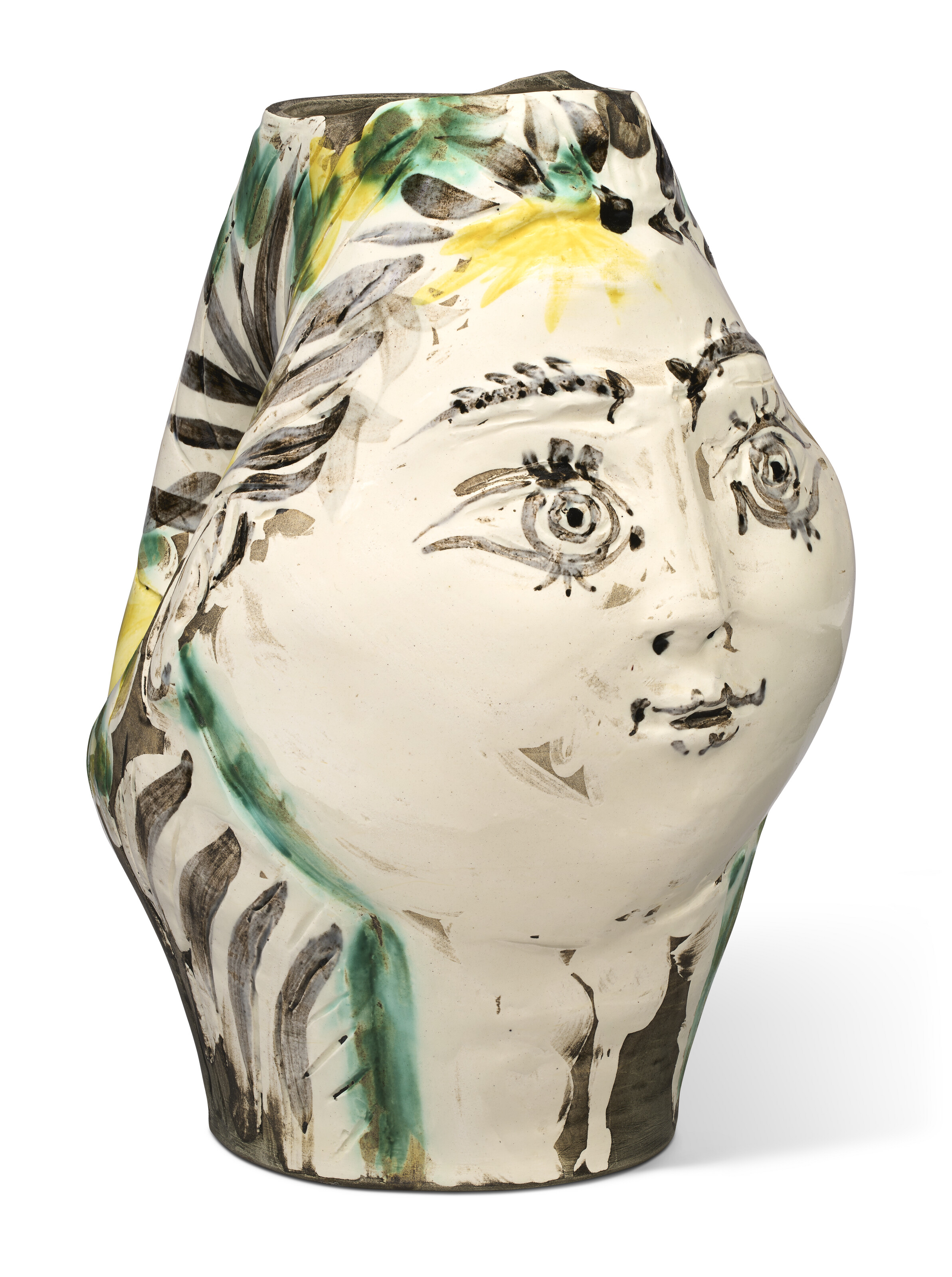 white earthenware ceramic pitcher, partially engraved, with colored engobe and glaze