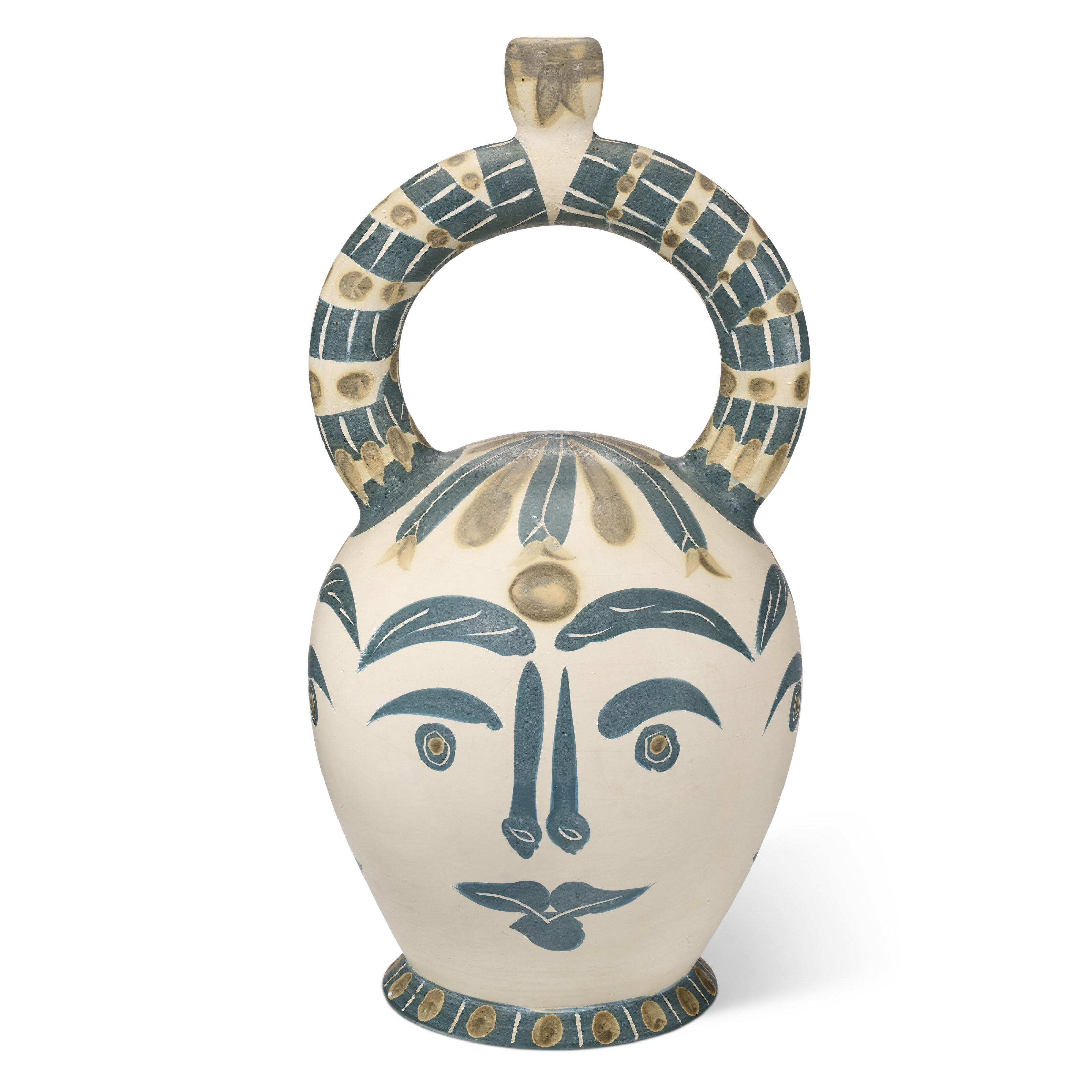 white earthenware ceramic pitcher, partially engraved, with colored engobe and glaze